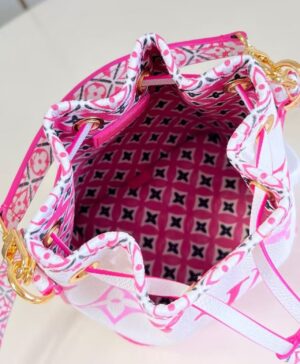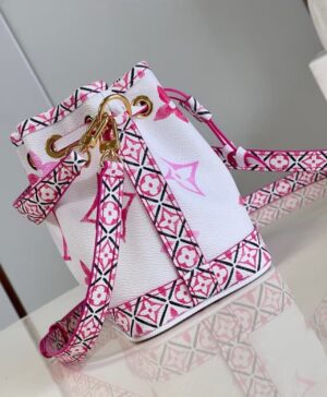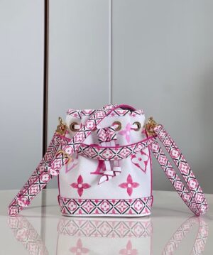 This edition of the Nano Noé belongs to the seasonal Resort collection. It comes in coated canvas printed with an oversized Monogram pattern in soft, summery tones, and features coordinating trim and lining. A miniature replica of the iconic Noé bag, it has a practical drawstring closure, a removable handle and a removable, adjustable shoulder strap.