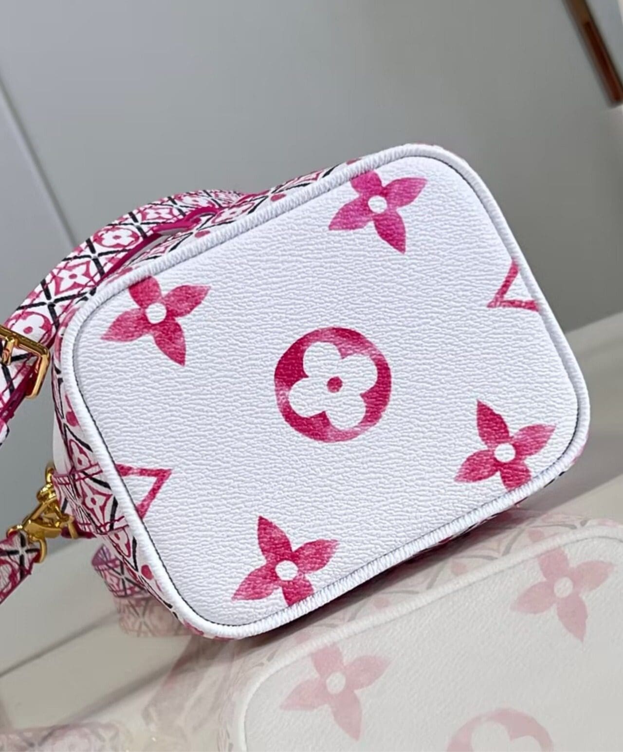 This edition of the Nano Noé belongs to the seasonal Resort collection. It comes in coated canvas printed with an oversized Monogram pattern in soft, summery tones, and features coordinating trim and lining. A miniature replica of the iconic Noé bag, it has a practical drawstring closure, a removable handle and a removable, adjustable shoulder strap.