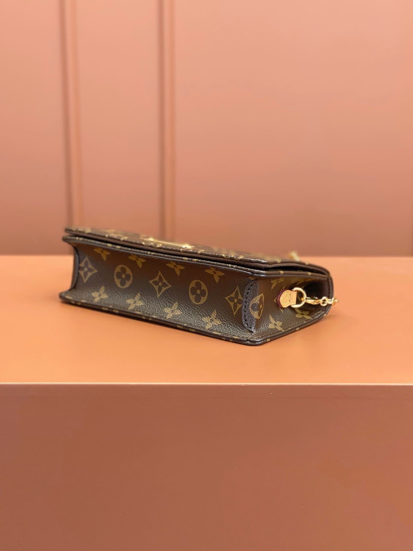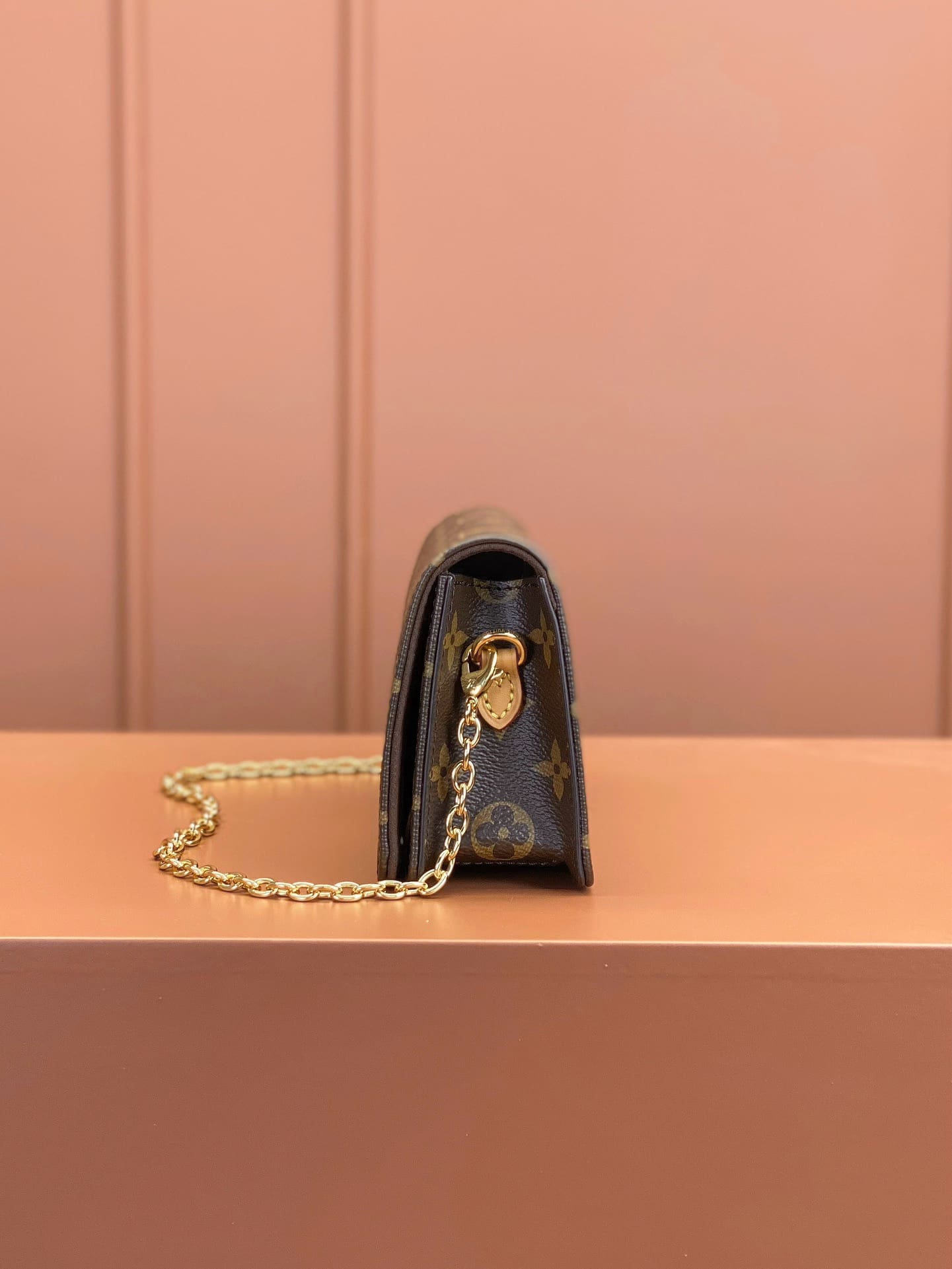 The Lily wallet on chain in Monogram canvas combines a sleek rectangular shape with a subtle retro look. Its flap features a gold-tone plate embellished with rivets and engraved with the Louis Vuitton signature. Large enough to carry essentials from day to evening, it offers different carry options thanks to its removable, adjustable chain with an LV Circle charm.