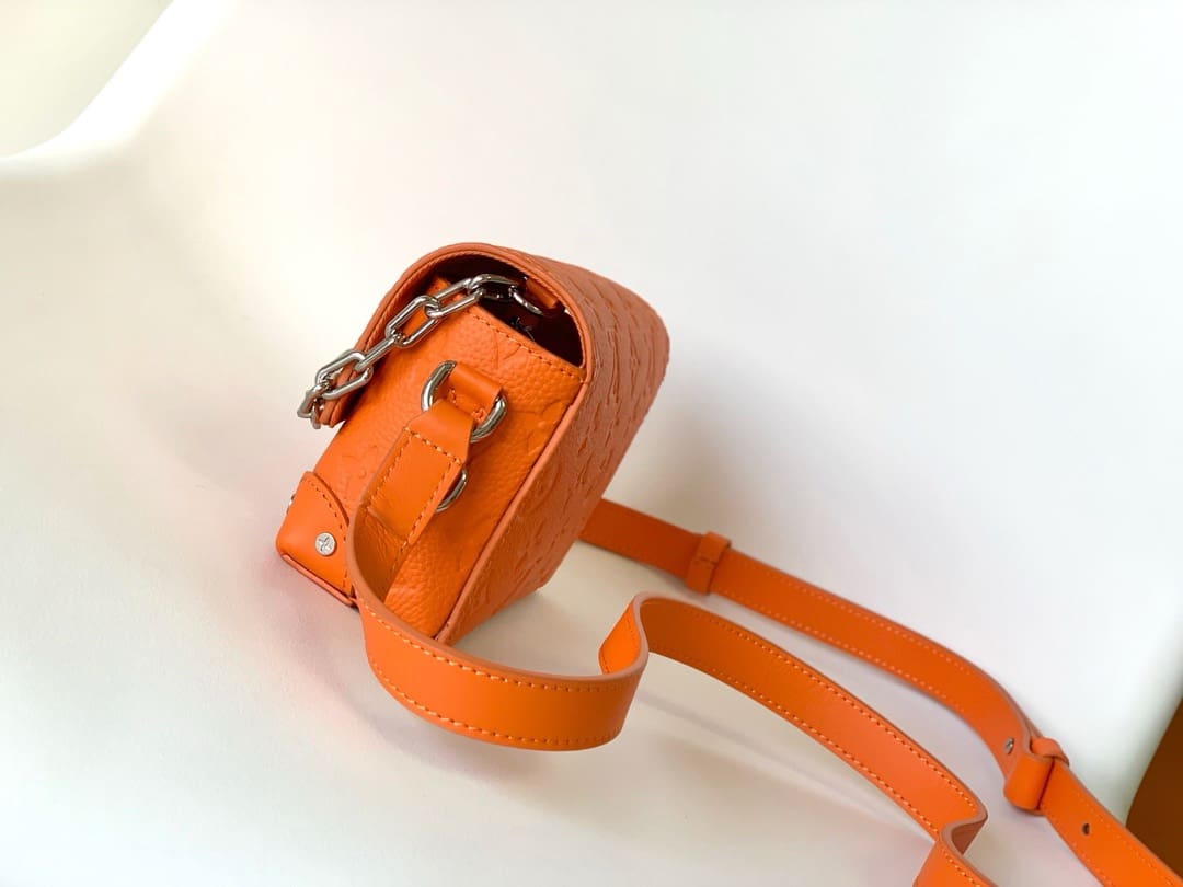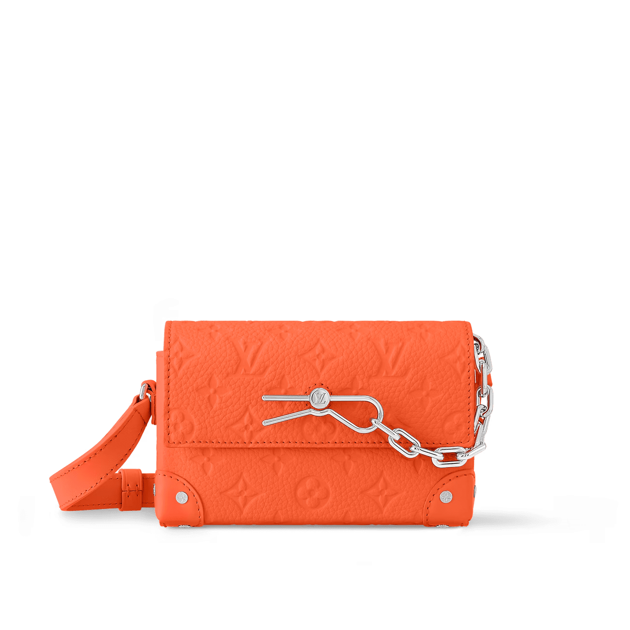 Inspired by the House’s vintage Steamer Trunk, the Steamer Wearable Wallet is fashioned from Taurillon cowhide leather in a bold summery colorway. Instantly recognizable by its pin and chain, the same found on the Streamer, it features an inside zipped pocket and magnetic closure to keep belongings secure.