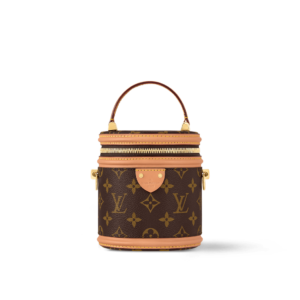 The Nano Cannes bag in Monogram canvas is notable for its cylindrical shape, which was inspired by a beauty case. This meticulously crafted piece is complemented by natural leather trim, including a tag embossed with the Louis Vuitton signature. Its top handle and adjustable, removable shoulder strap offer different carry options.