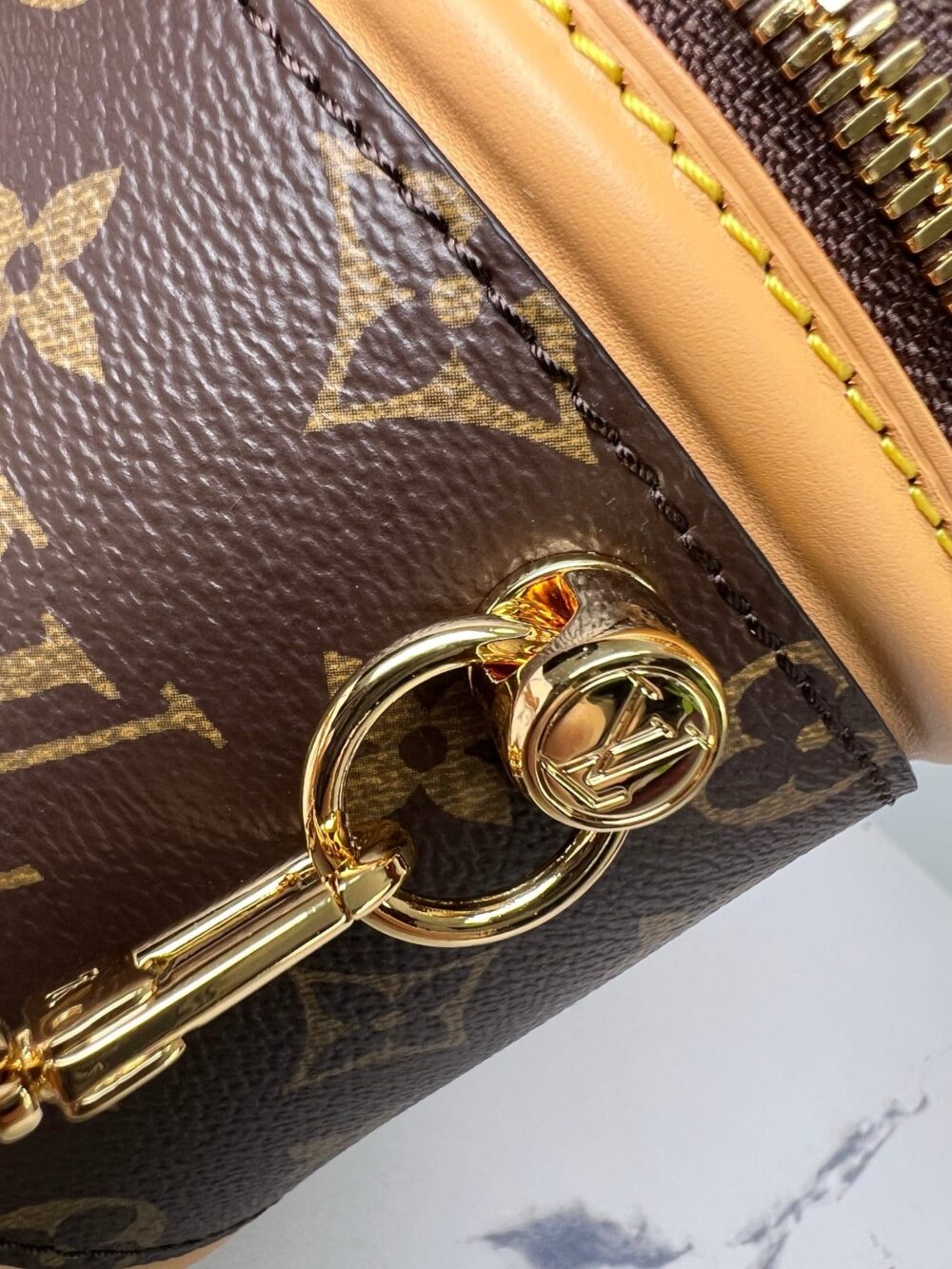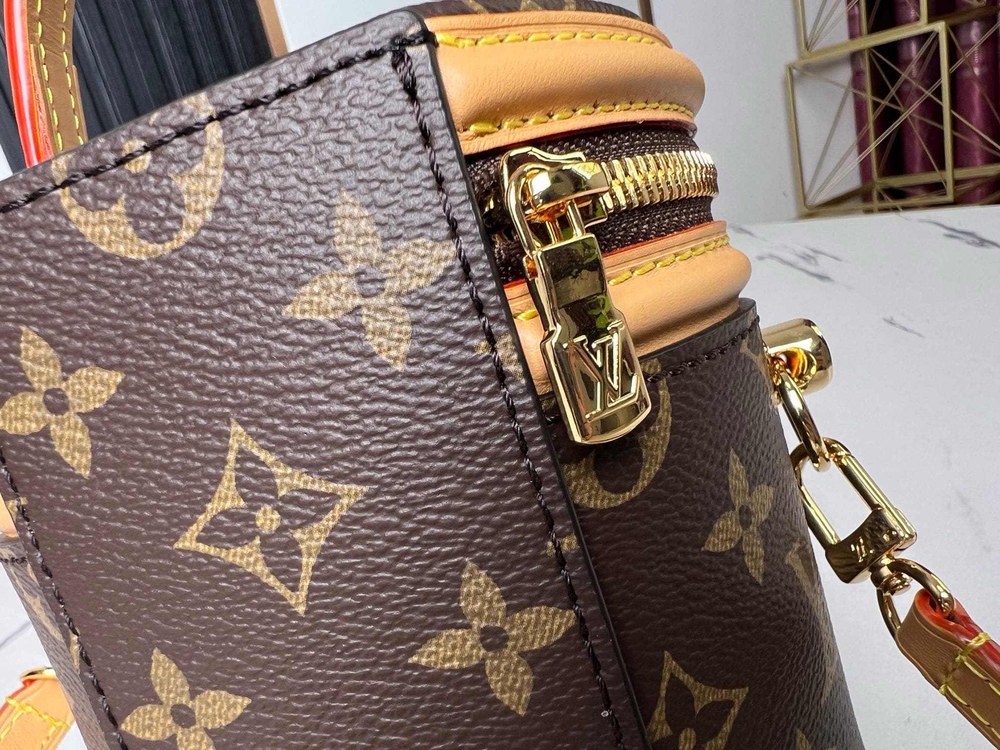 The Nano Cannes bag in Monogram canvas is notable for its cylindrical shape, which was inspired by a beauty case. This meticulously crafted piece is complemented by natural leather trim, including a tag embossed with the Louis Vuitton signature. Its top handle and adjustable, removable shoulder strap offer different carry options.