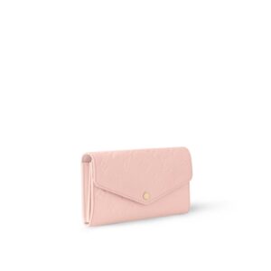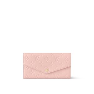 The elegant lines of the Sarah wallet are complemented by pastel-hued Monogram Empreinte leather, which is discreetly embossed with the Monogram pattern. This wallet is characterized by its rectangular format and envelope-style flap, which is sealed with an engraved, pale gold-tone press stud. It contains two spacious compartments, a zipped coin pocket and 16 card slots.
