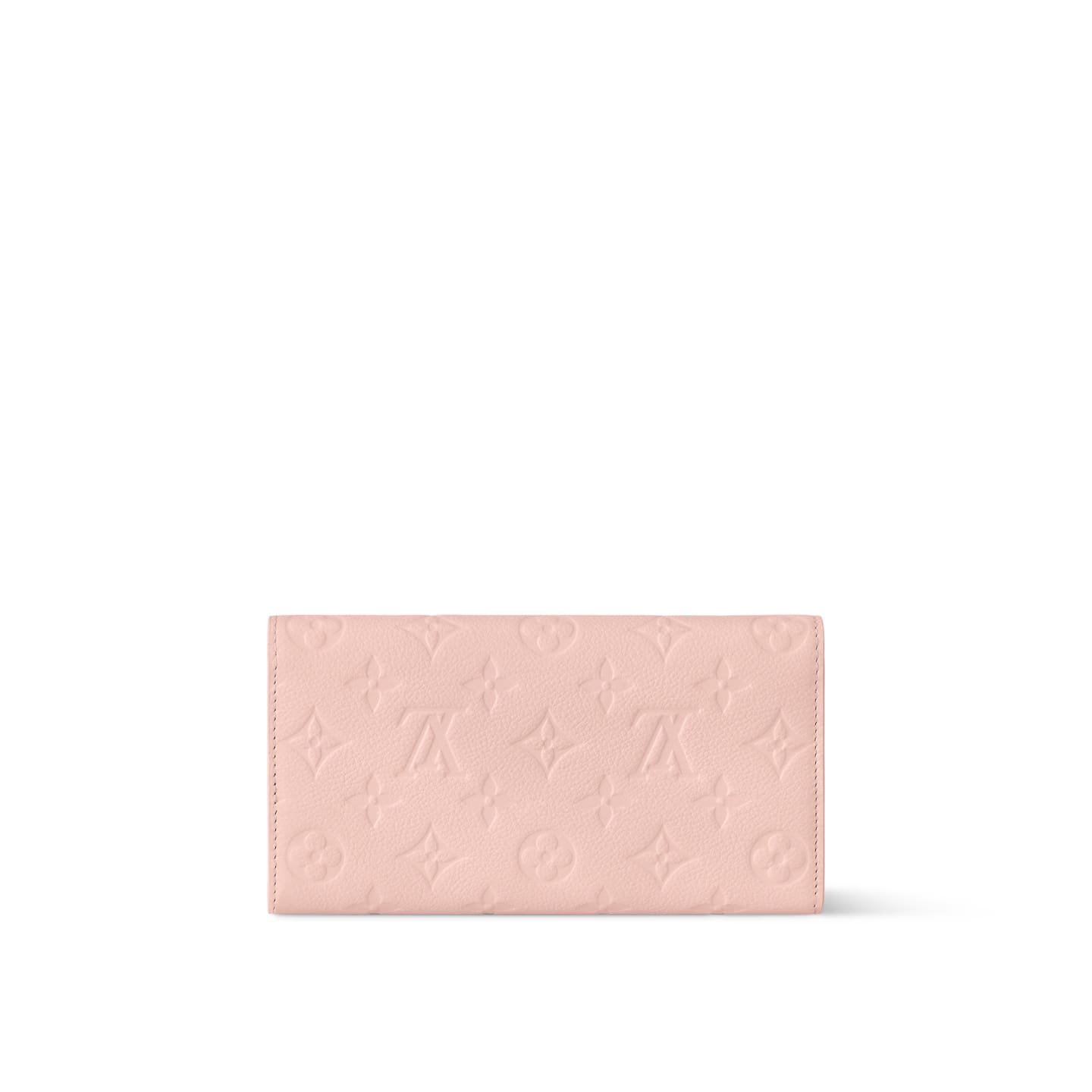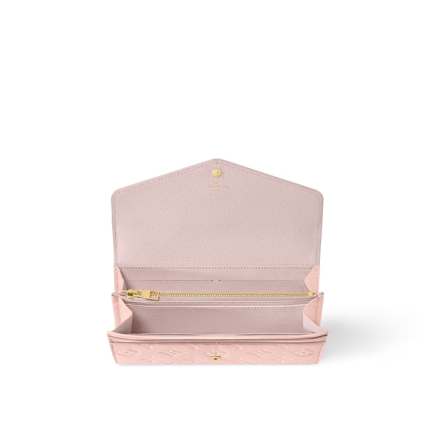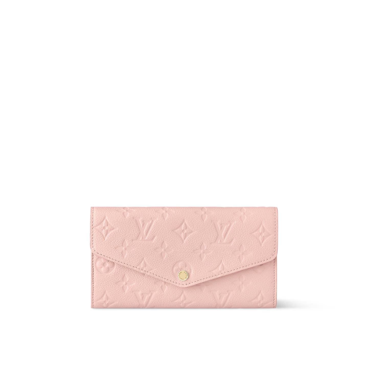 The elegant lines of the Sarah wallet are complemented by pastel-hued Monogram Empreinte leather, which is discreetly embossed with the Monogram pattern. This wallet is characterized by its rectangular format and envelope-style flap, which is sealed with an engraved, pale gold-tone press stud. It contains two spacious compartments, a zipped coin pocket and 16 card slots.