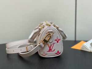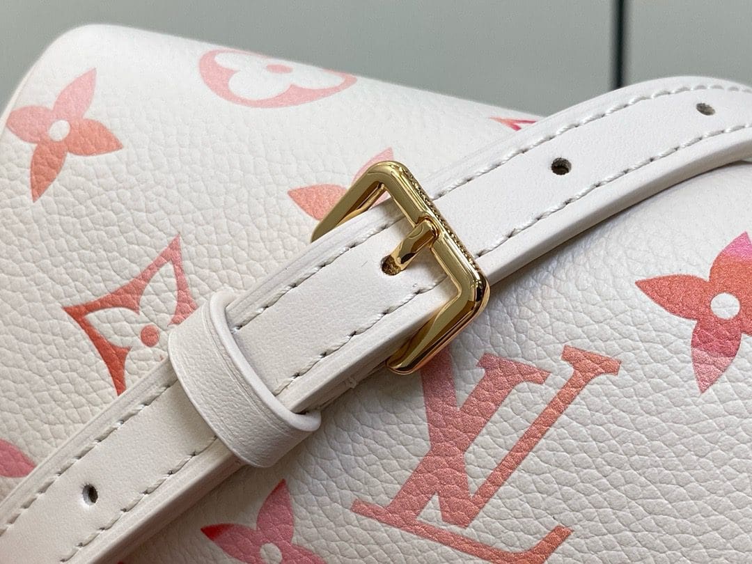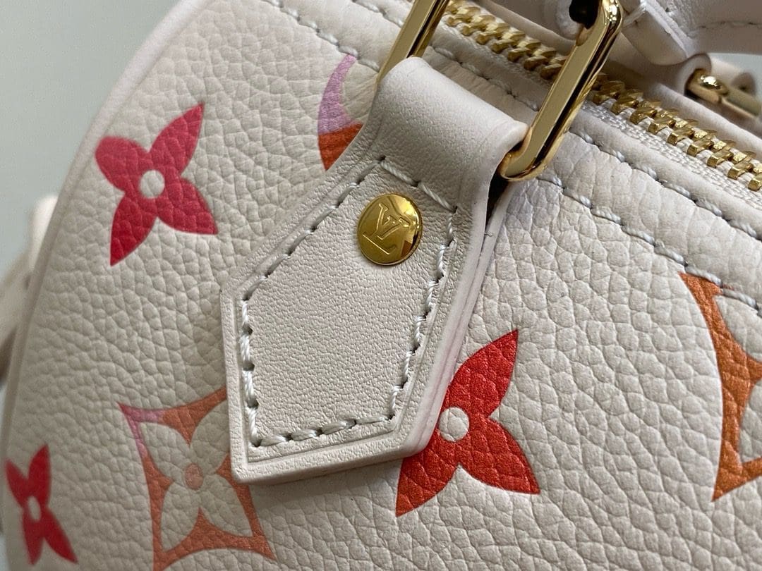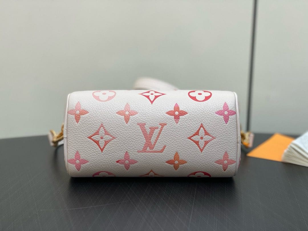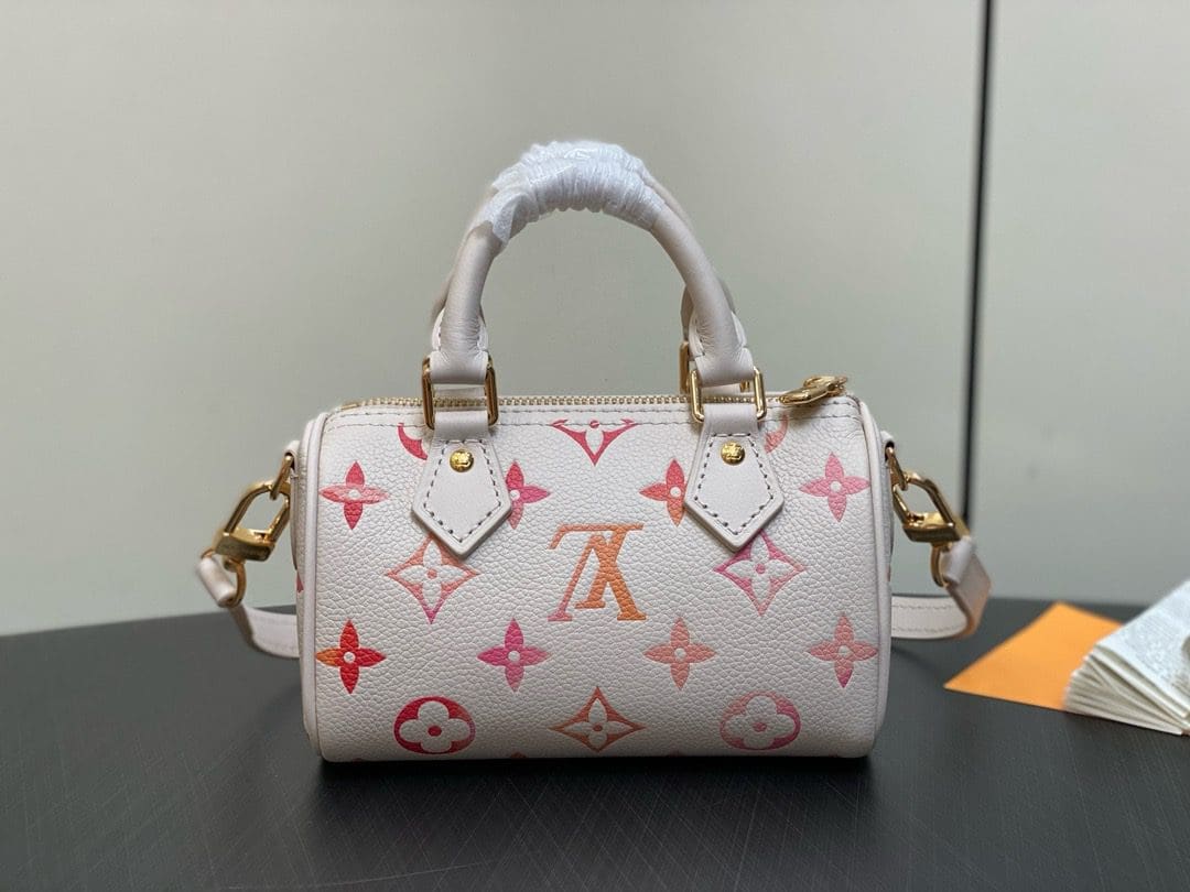 For the Sunrise Aquarelle collection, the Nano Speedy bag is revisited in Monogram Empreinte leather, which is digitally printed with sunrise shades to create a painterly, watercolor effect. This mini replica of the iconic Speedy has two handles and a removable, adjustable shoulder strap, which offer different looks and carry options.