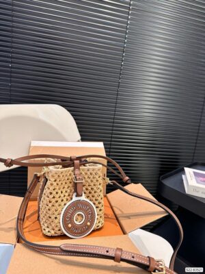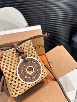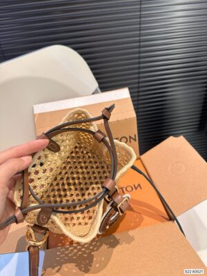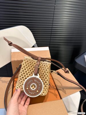 This exceptional edition of the Noé purse is crafted from pure natural raffia, which is painstakingly crocheted by hand. Refined leather trim complements this design, whose drawstring closure was inspired by the iconic Noé bag. Both the shoulder strap and the Louis Vuitton signature patch are removable, offering different looks and wear options.
