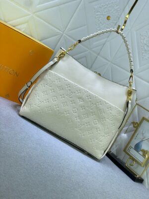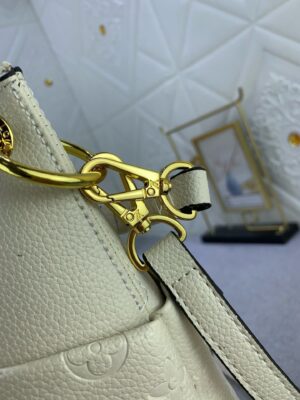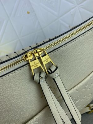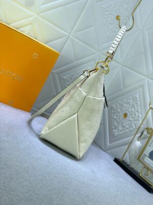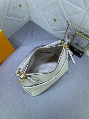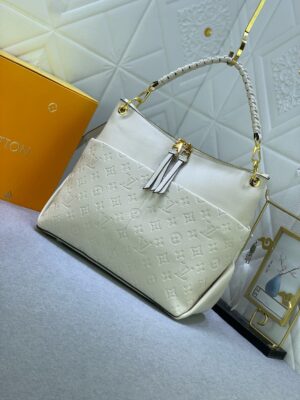 Louis Vuitton Maida Hobo zipped bag, Mix of grained leather and Monogram Empreinte leather in Tourterelle White color. Removable top handle in braided leather for comfortable elbow or shoulder carry. Two large front pockets, ideal for quick access to essentials. Gold color hardware.