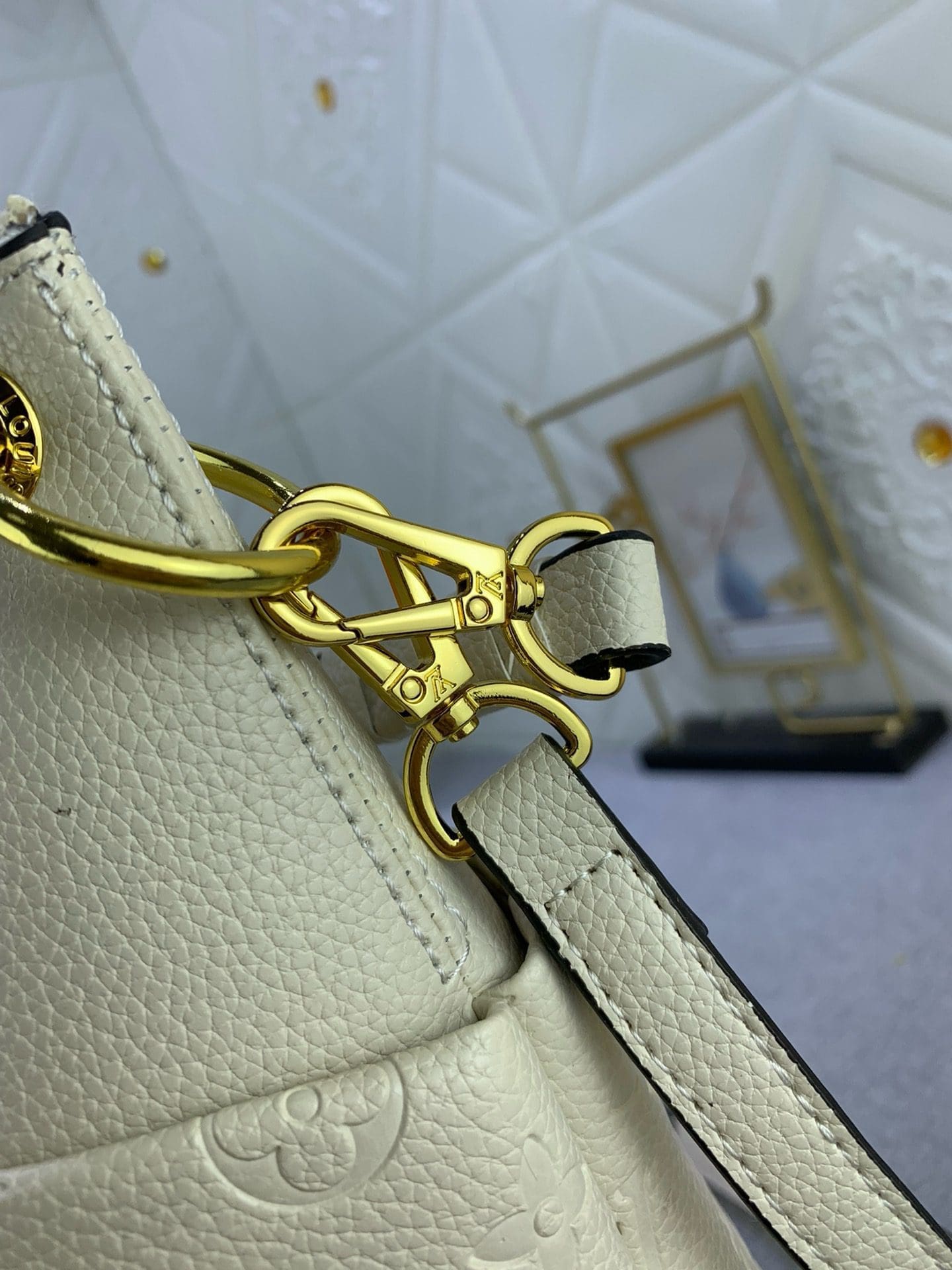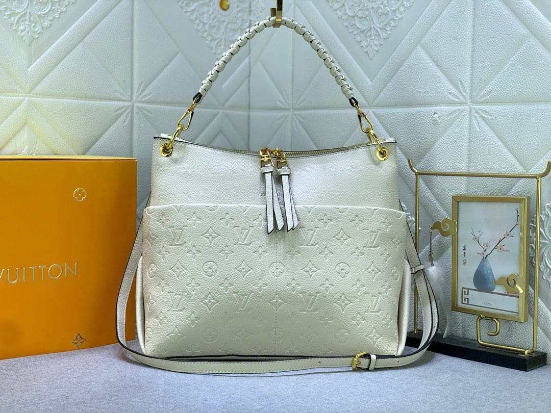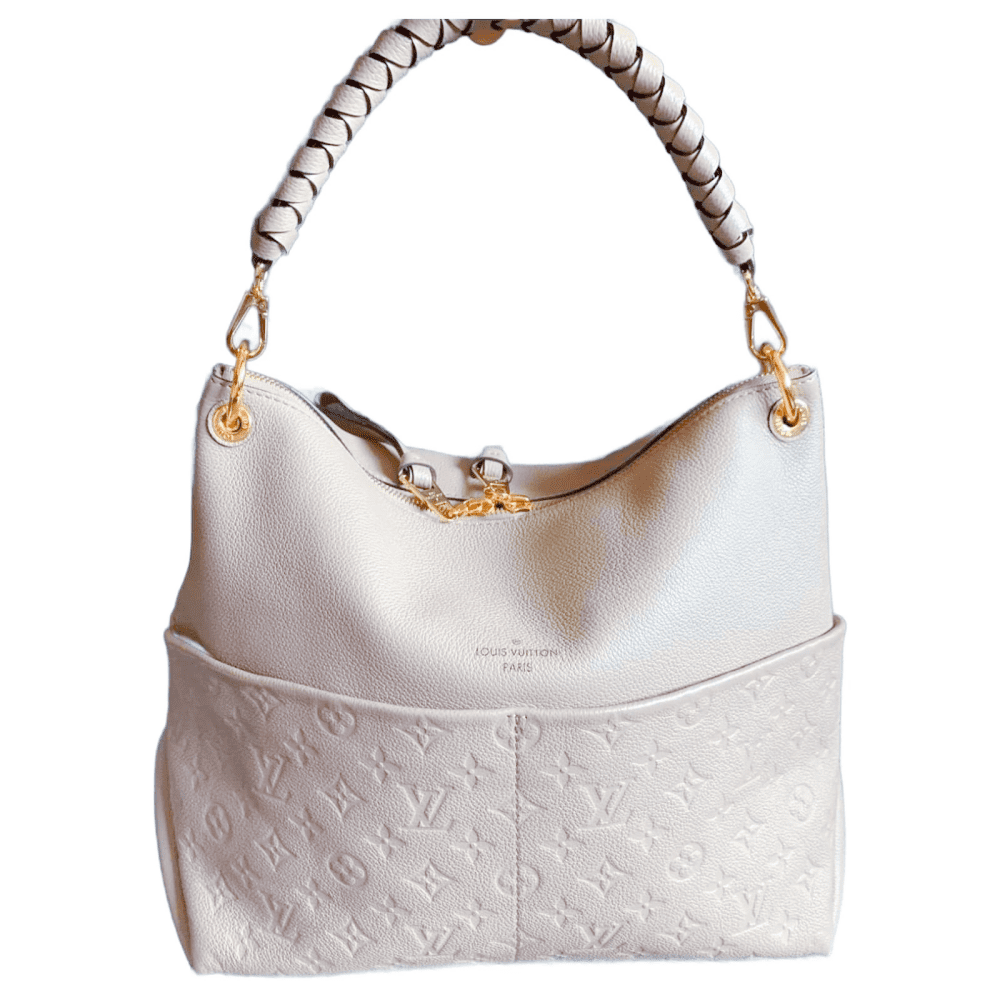 Louis Vuitton Maida Hobo zipped bag, Mix of grained leather and Monogram Empreinte leather in Tourterelle White color. Removable top handle in braided leather for comfortable elbow or shoulder carry. Two large front pockets, ideal for quick access to essentials. Gold color hardware.