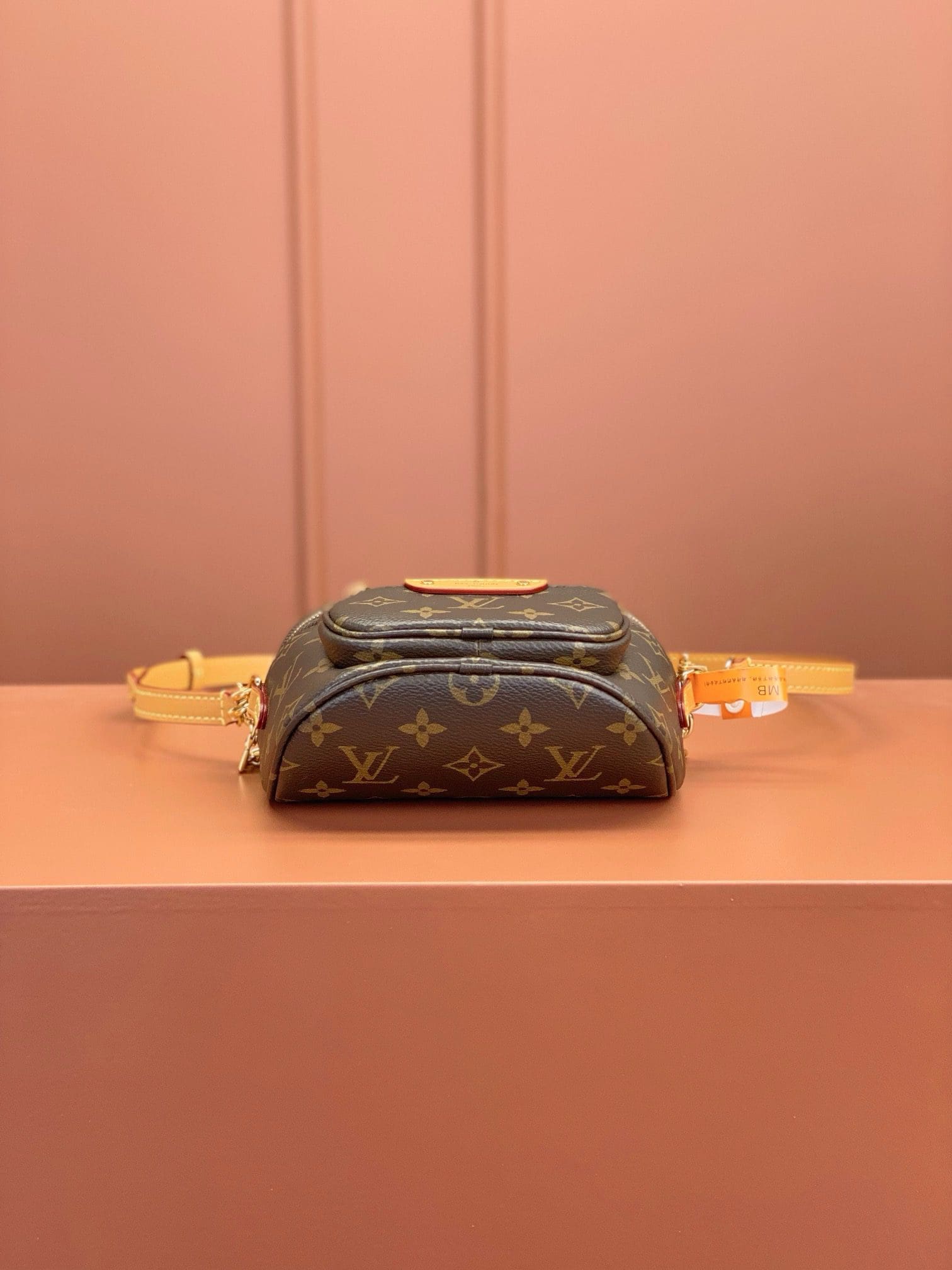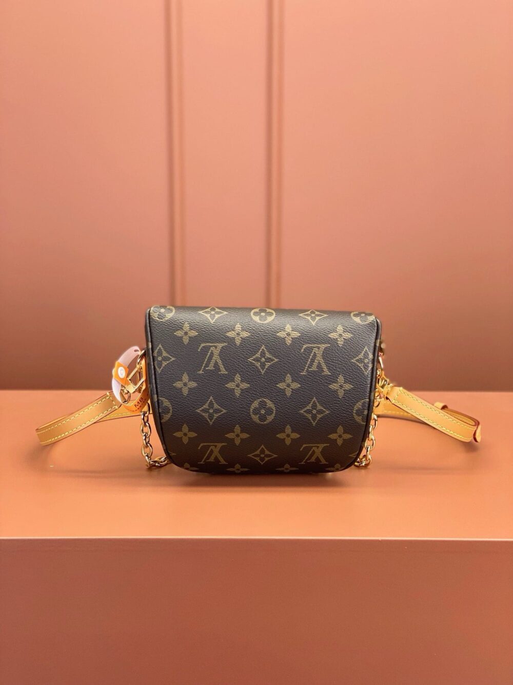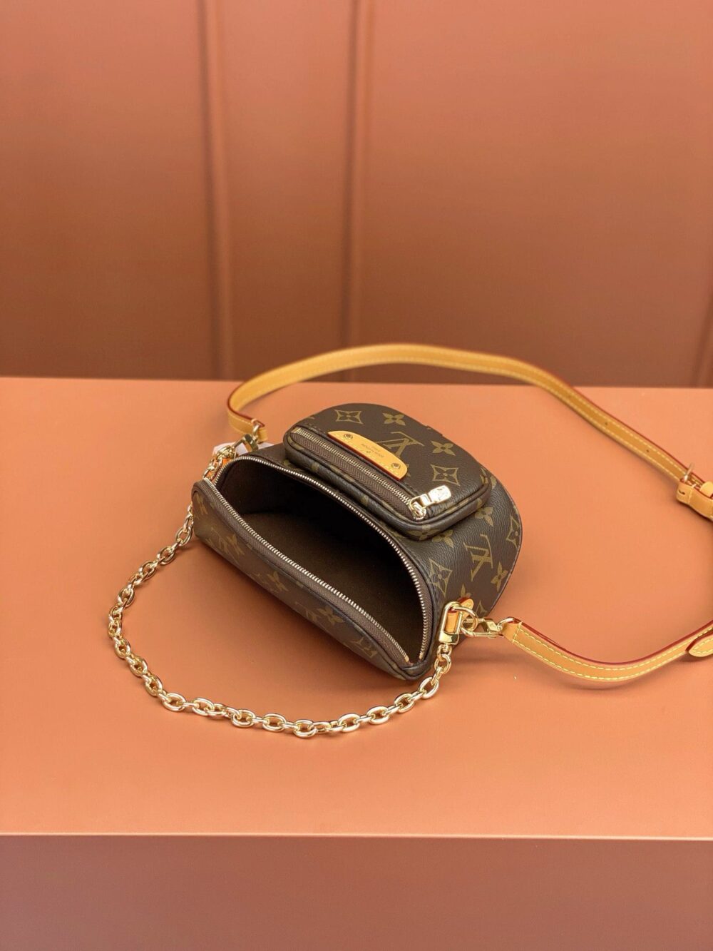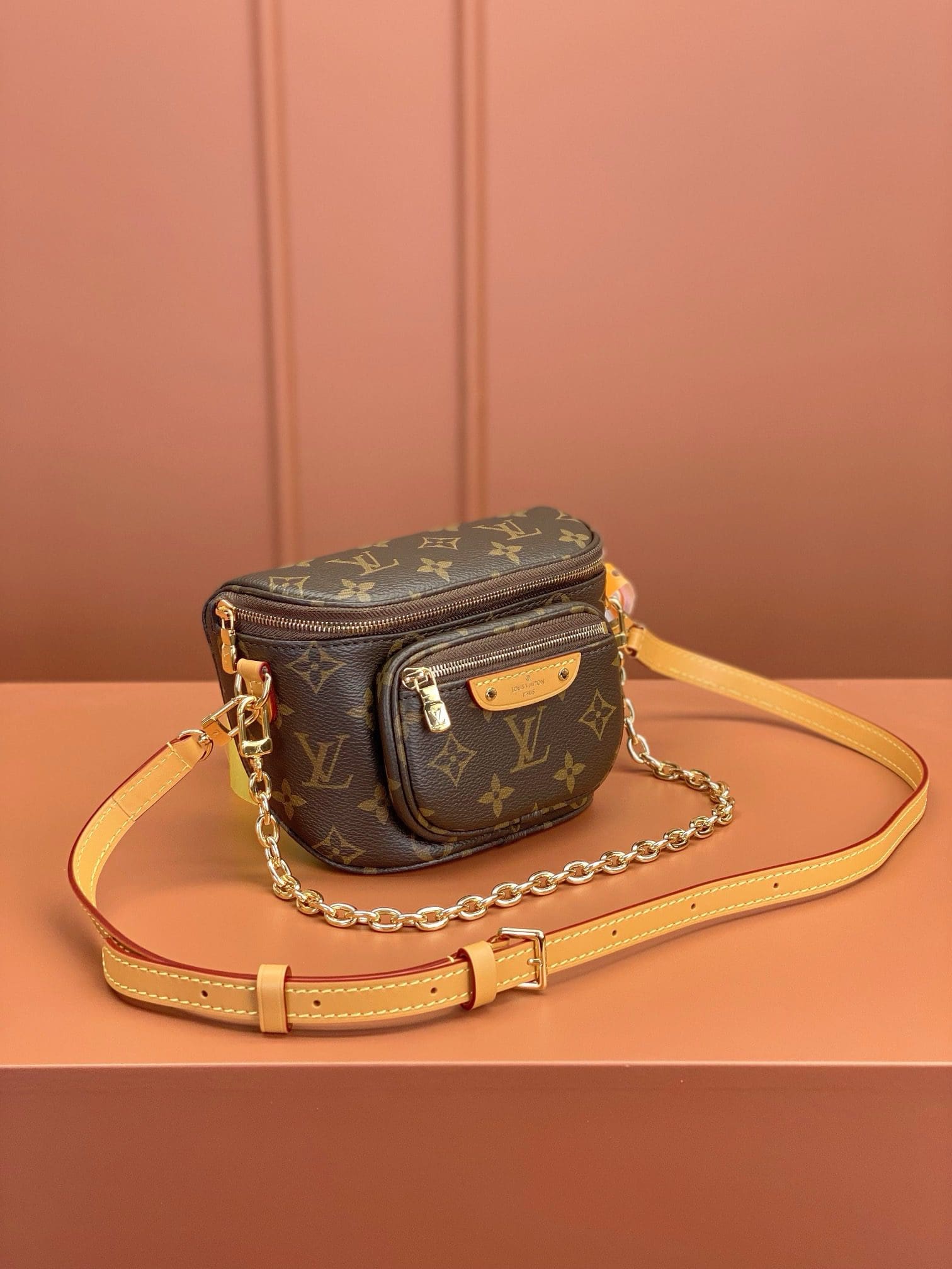 The Mini Bumbag in Monogram canvas is Louis Vuitton’s feminine interpretation of the on-trend bumbag format. Designed for versatility, it features a removable, adjustable strap in the House’s emblematic natural leather, as well as a removable gold-tone chain, which can be functional or decorative. The bag has a zipped main compartment and a zipped front pocket with an embossed leather tag.