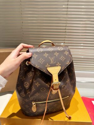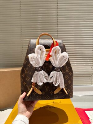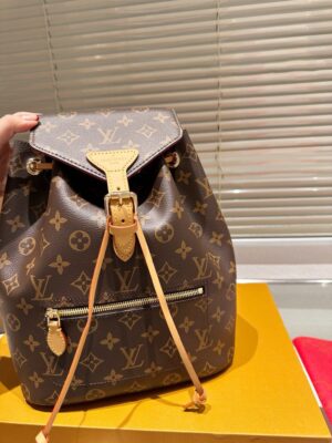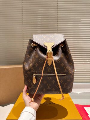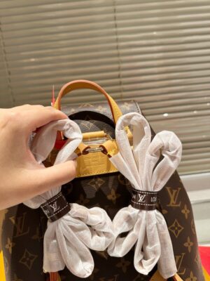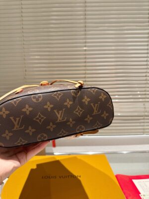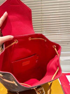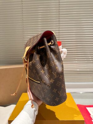 25.5 x 29 x 9 cm(length x height x width)•10 x 11.4 x 3.5 inches•Monogram coated canvas•Natural cowhide leather trim•Bonded microfiber lining•Shiny gold color metal hardware•Adjustable shoulder straps•Drawstring top closure secured by a buckle•Outside zipped pocket•Inside flat pocket
