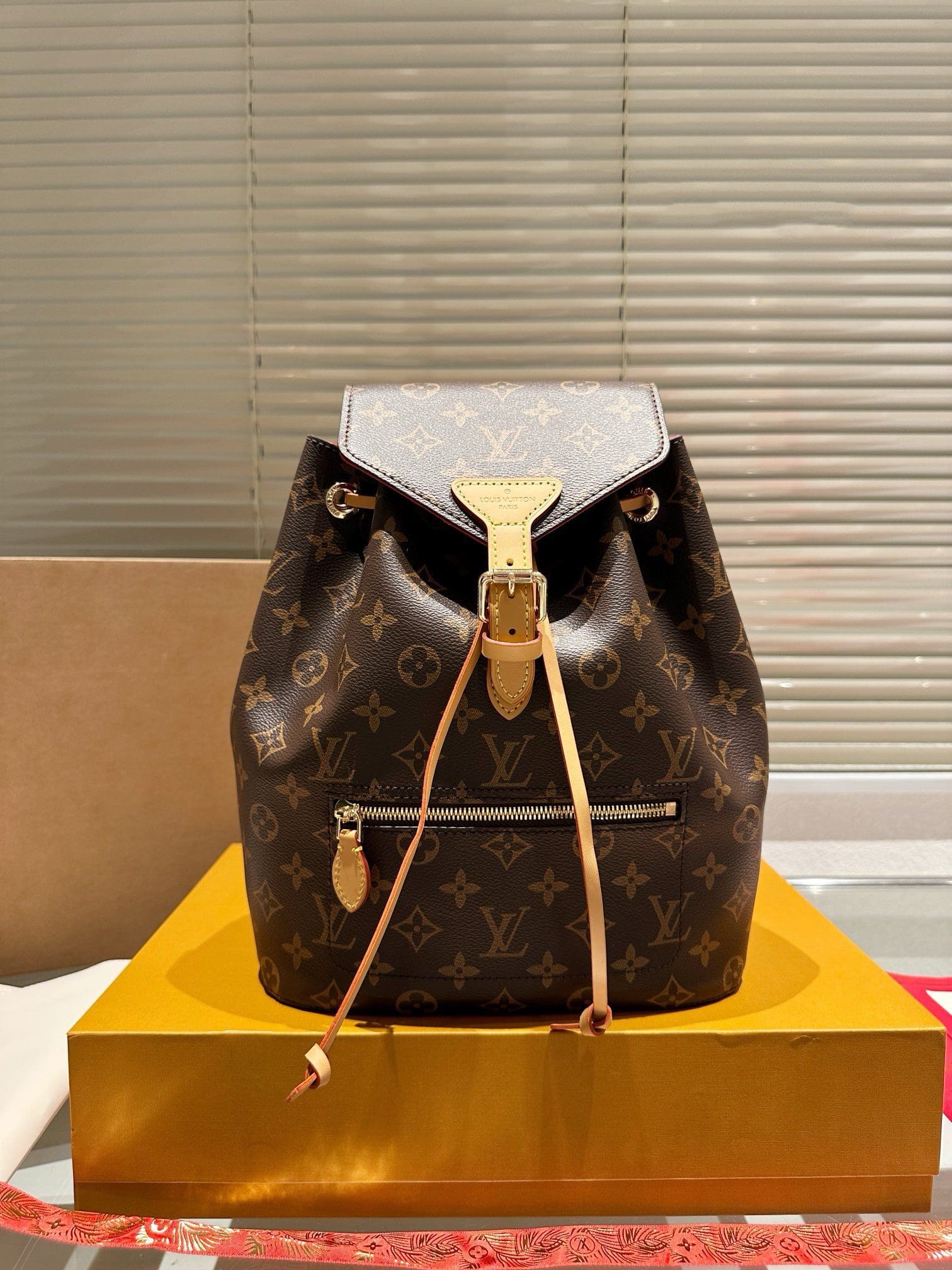 25.5 x 29 x 9 cm(length x height x width)•10 x 11.4 x 3.5 inches•Monogram coated canvas•Natural cowhide leather trim•Bonded microfiber lining•Shiny gold color metal hardware•Adjustable shoulder straps•Drawstring top closure secured by a buckle•Outside zipped pocket•Inside flat pocket