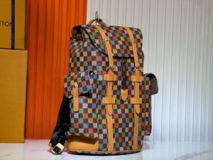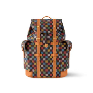 The Christopher Medium Backpack is made from LVers Damier Ebene canvas, with a colorful checkerboard pattern that displays various flags, reflecting the unity tone that Pharrell Williams has set for the collection. It features a ball tag with the words “LVERS UNITED” engraved on it.