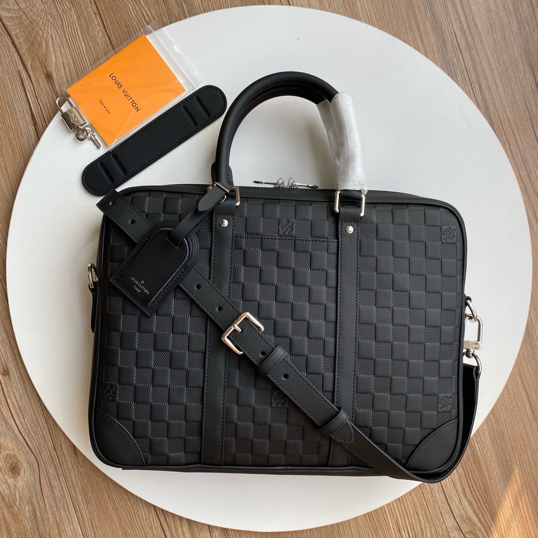 Damier Infini cowhide leather, with its emblematic checkerboard pattern embossed into the leather, brings subtle elegance to this Porte-Documents Voyage PM briefcase. The rolled-leather top handles and removable name tag, also in leather, give it a statutory feel while the adjustable – and detachable – shoulder strap makes it practical.