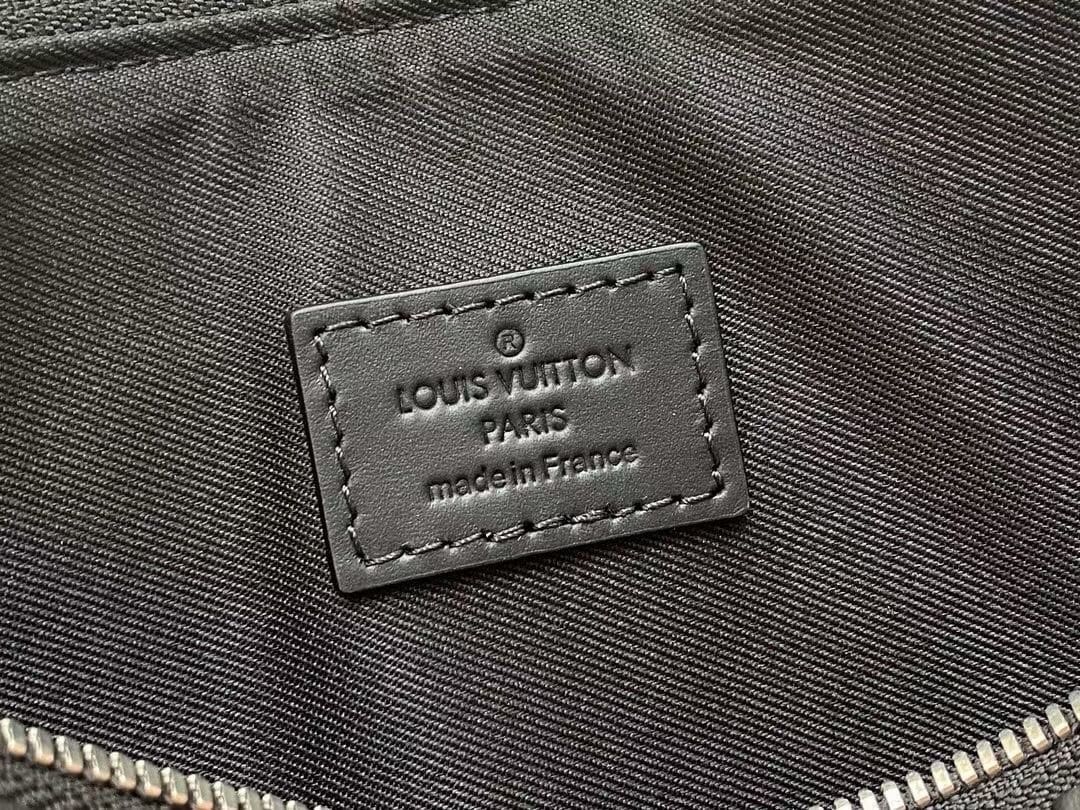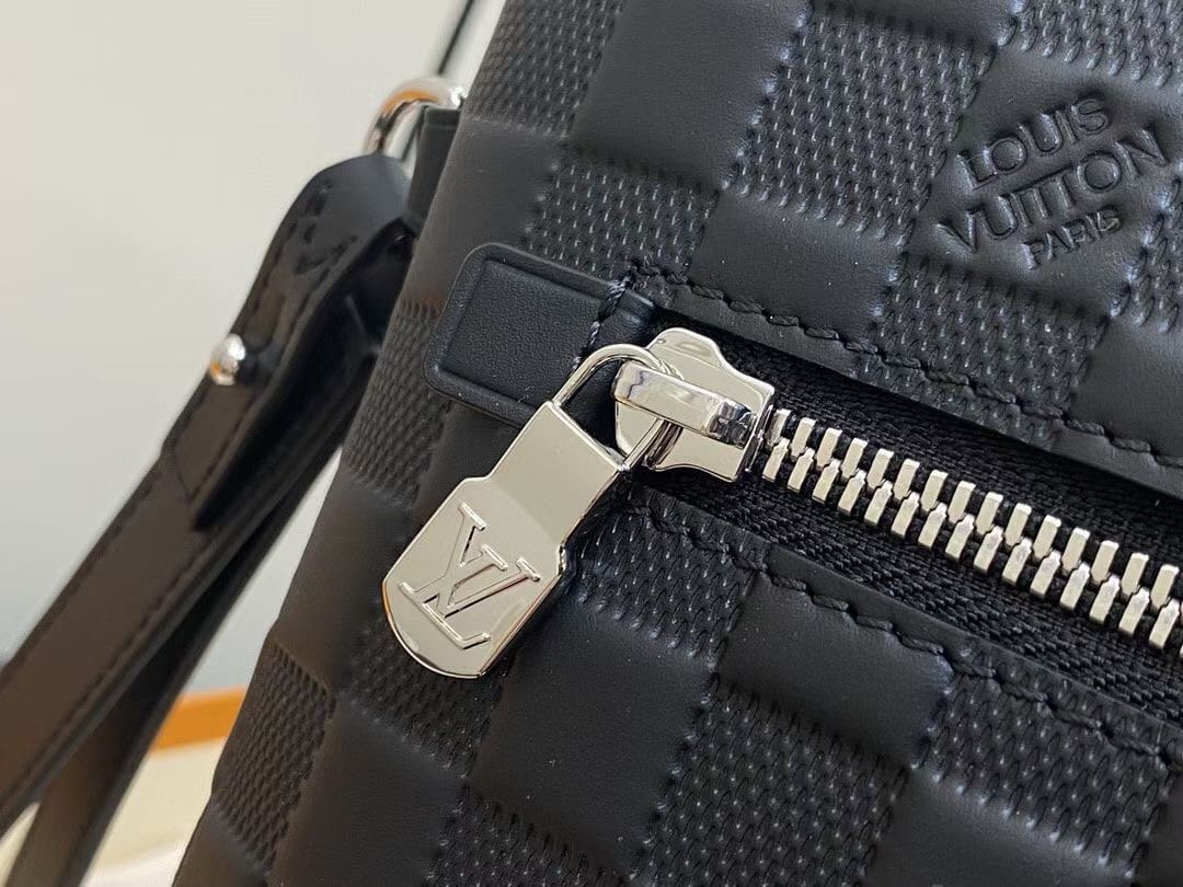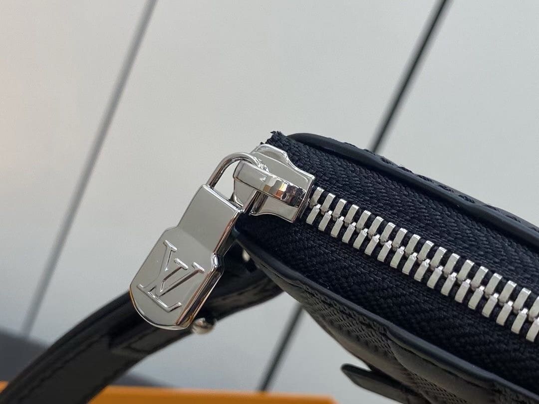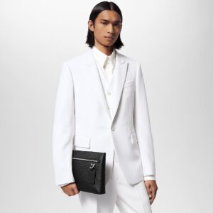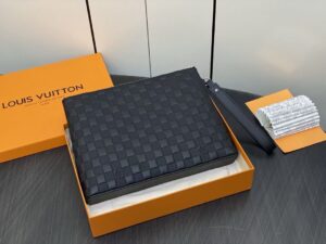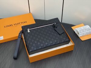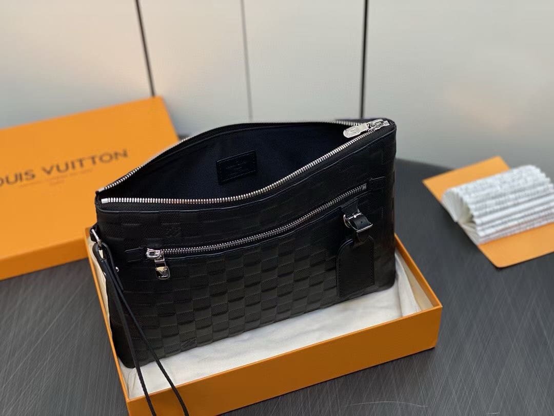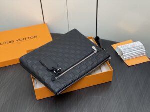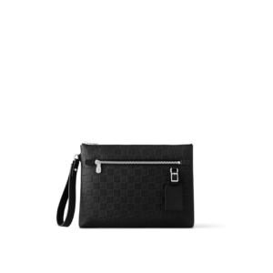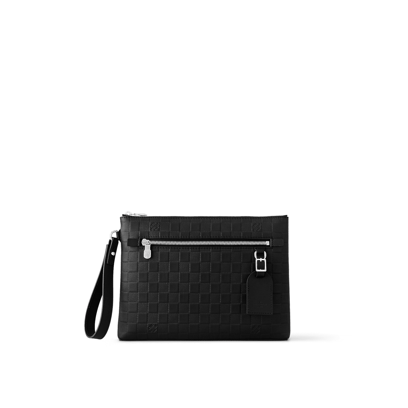 The Takeoff Pouch is made from Damier Infini leather with black-color zippers on the front pocket and top. Large enough to carry an iPad, this small bag is perfect for more formal occasions. A leather name tag on a small D-ring on the front pocket contributes to the overall impression of modern luxury.