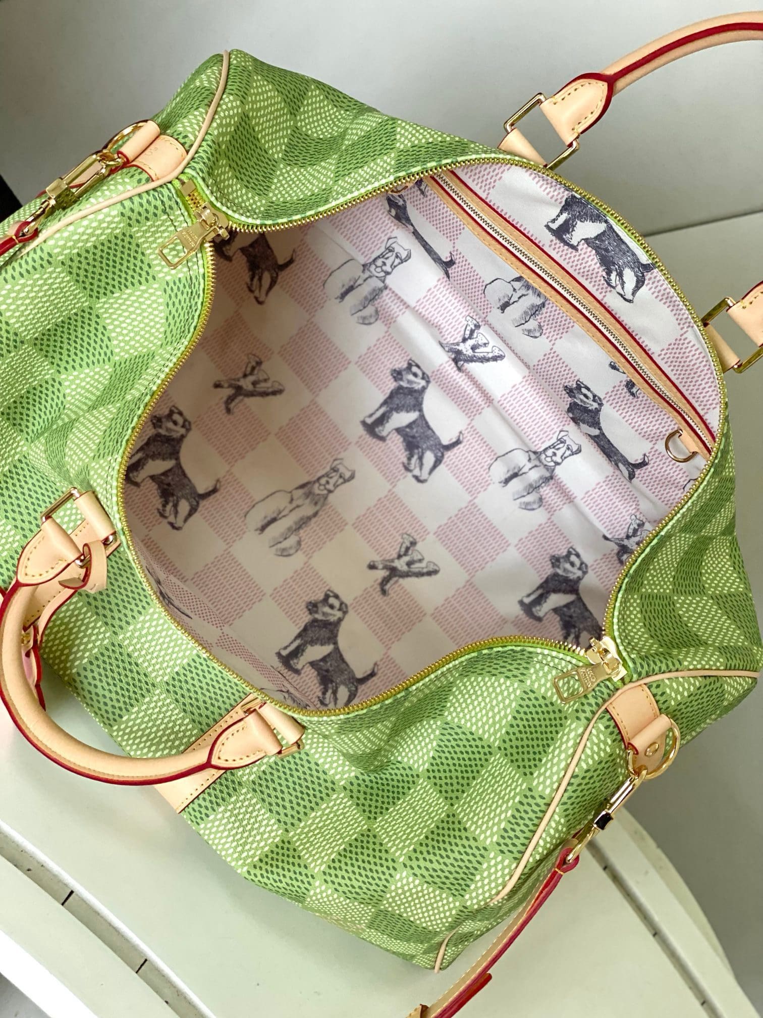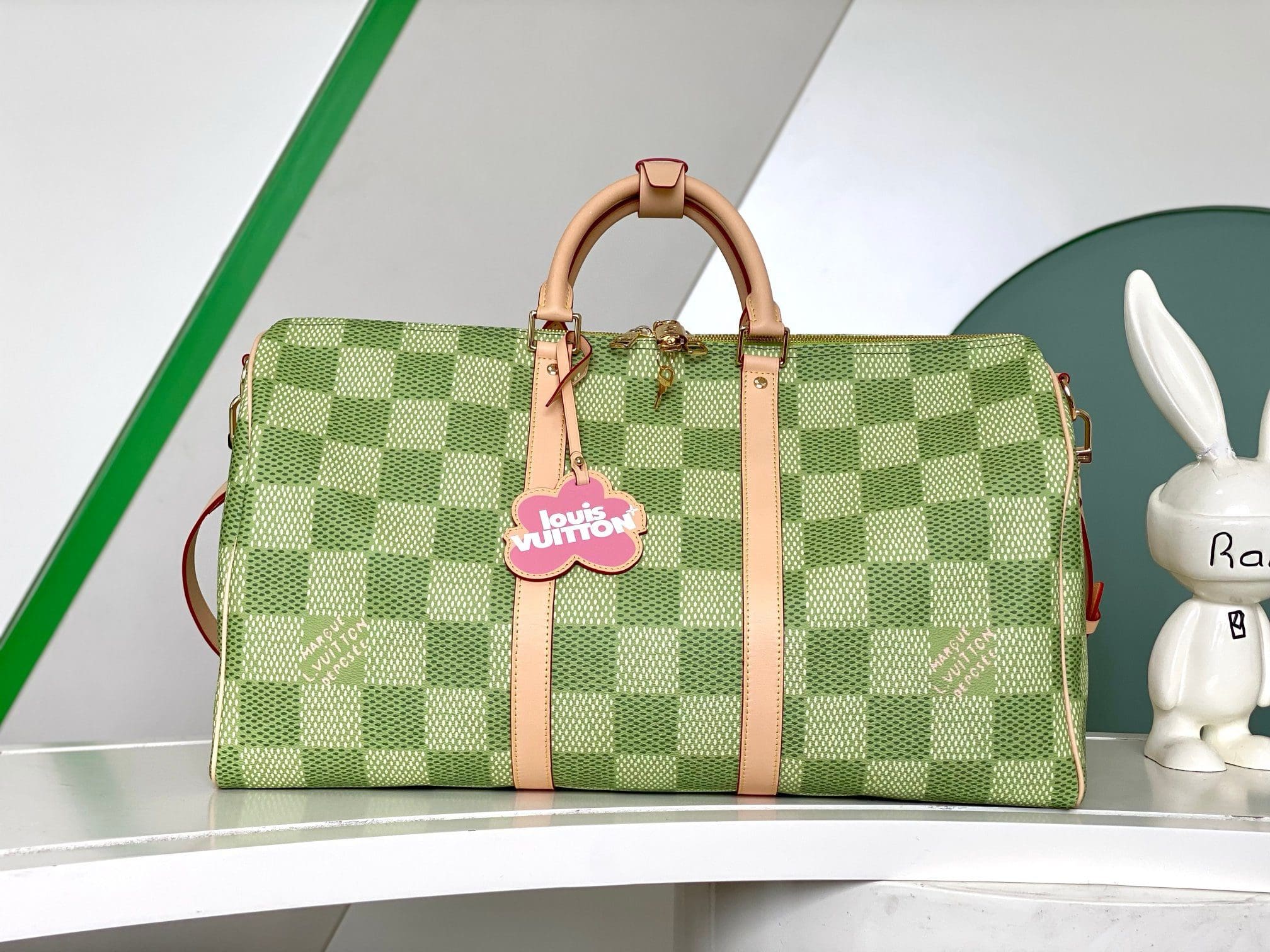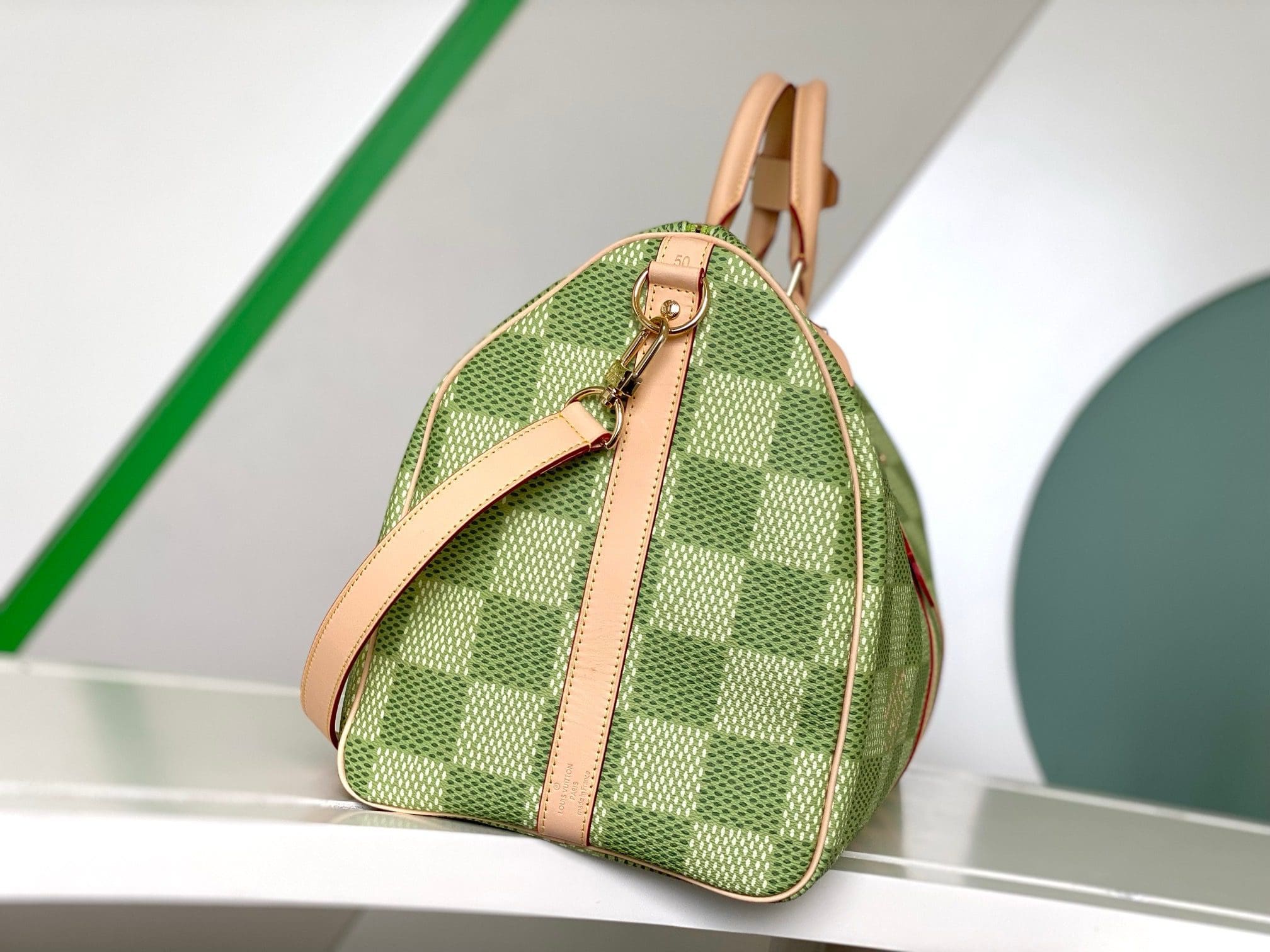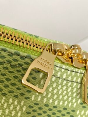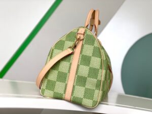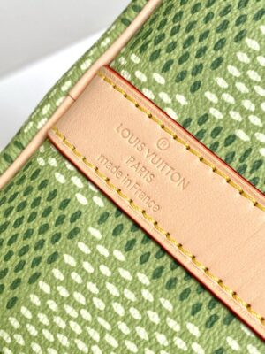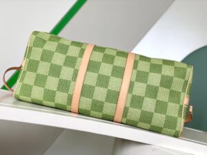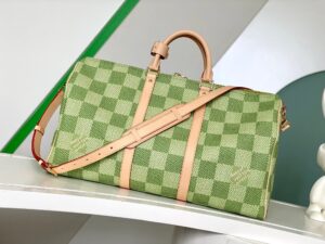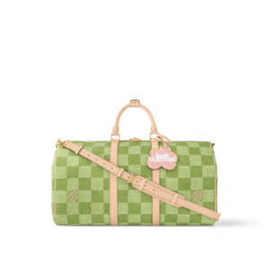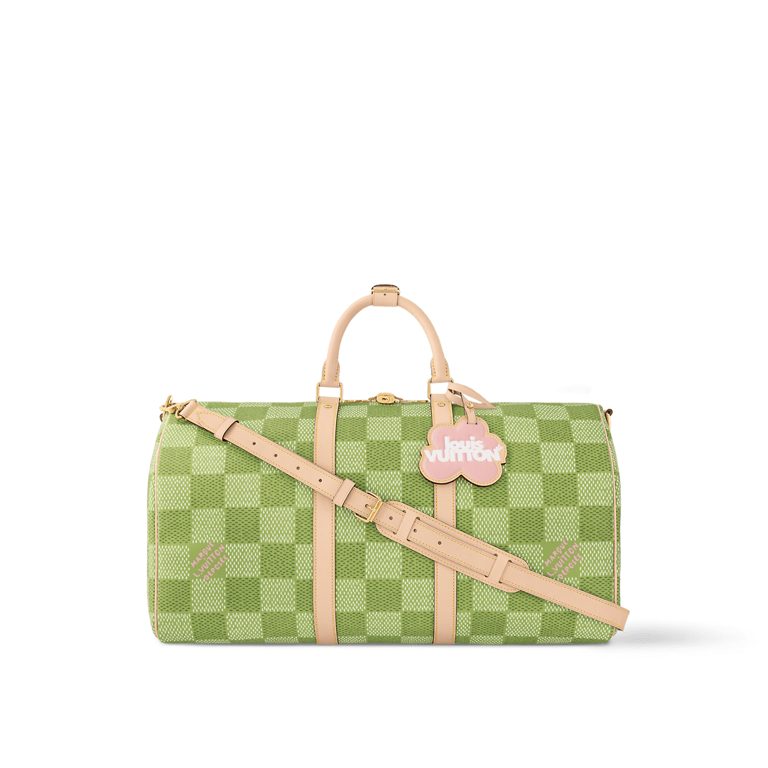 Classic and bold at once, the new Damier Golf coated canvas, with its golf-links inspired colorway, brings panache to the Keepall Bandoulière 50. The bag’s recognizable shape, emphasized by the cowhide-leather side bands and top handles, are signed with a pink Louis Vuitton flower charm. A removable leather strap adjusts for comfortable shoulder carry.