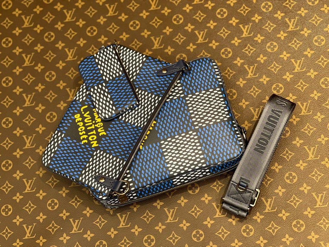 The Trio Messenger bag is made from Damier Heritage canvas, Pharrell Williams’ latest exploration of the House’s emblematic checkerboard pattern. A hybrid bag, the Trio combines a main compartment with a removable front zipped pocket. The adjustable and removable textile strap is signed “Louis Vuitton” and features a small detachable coin purse.