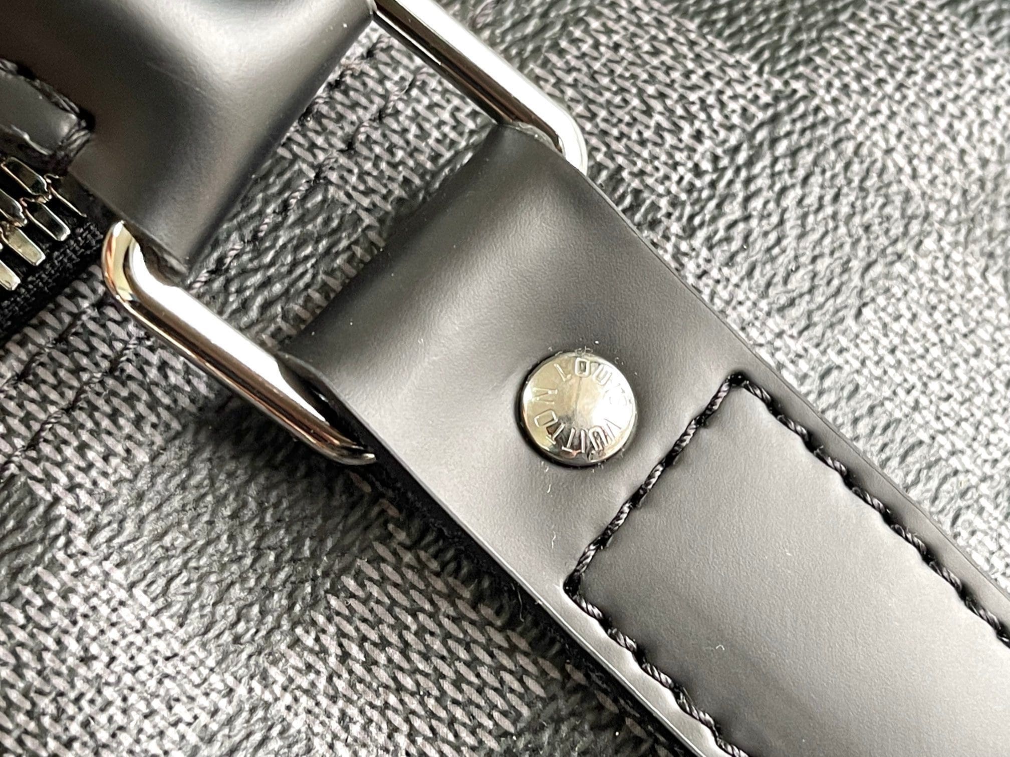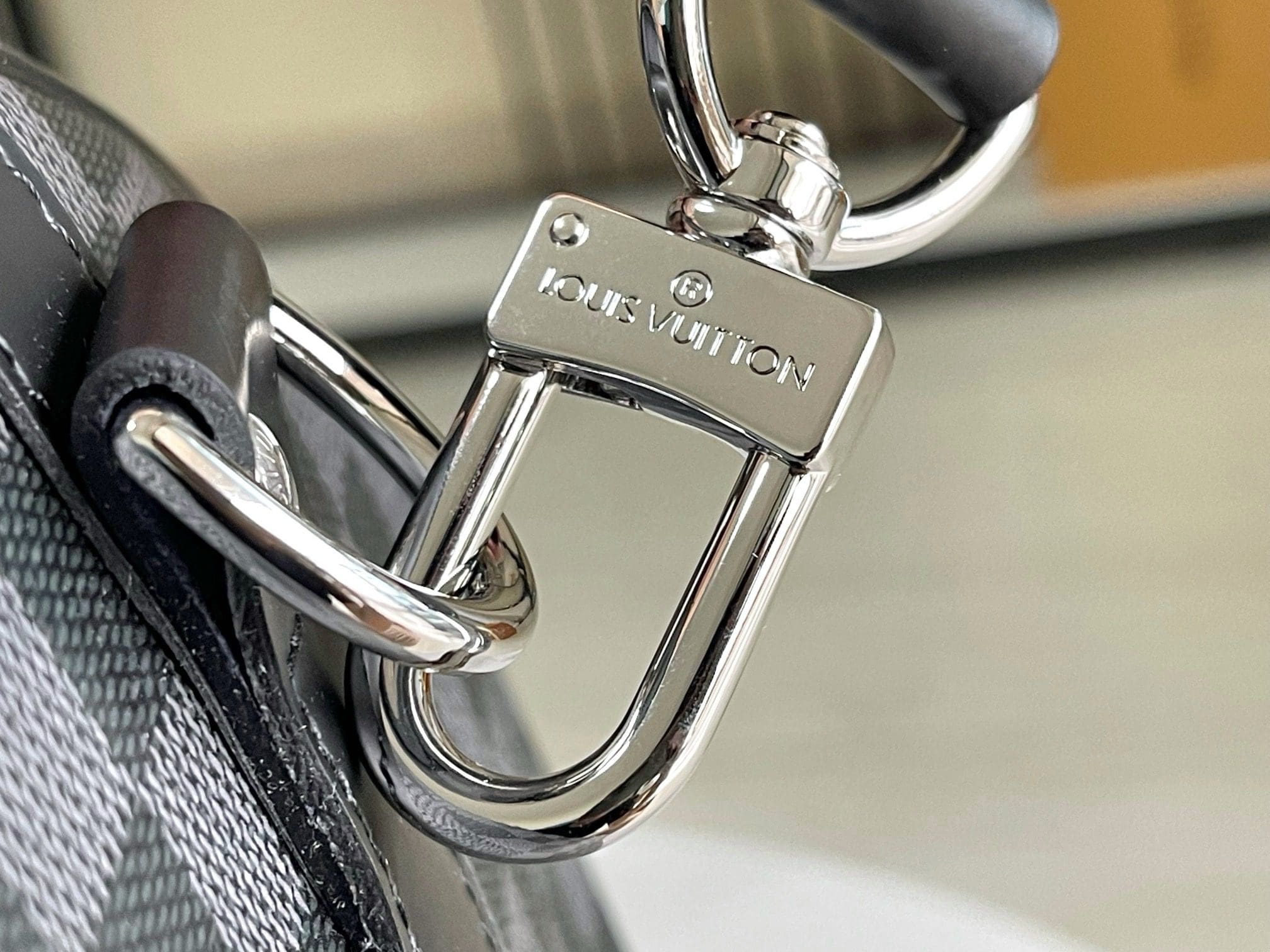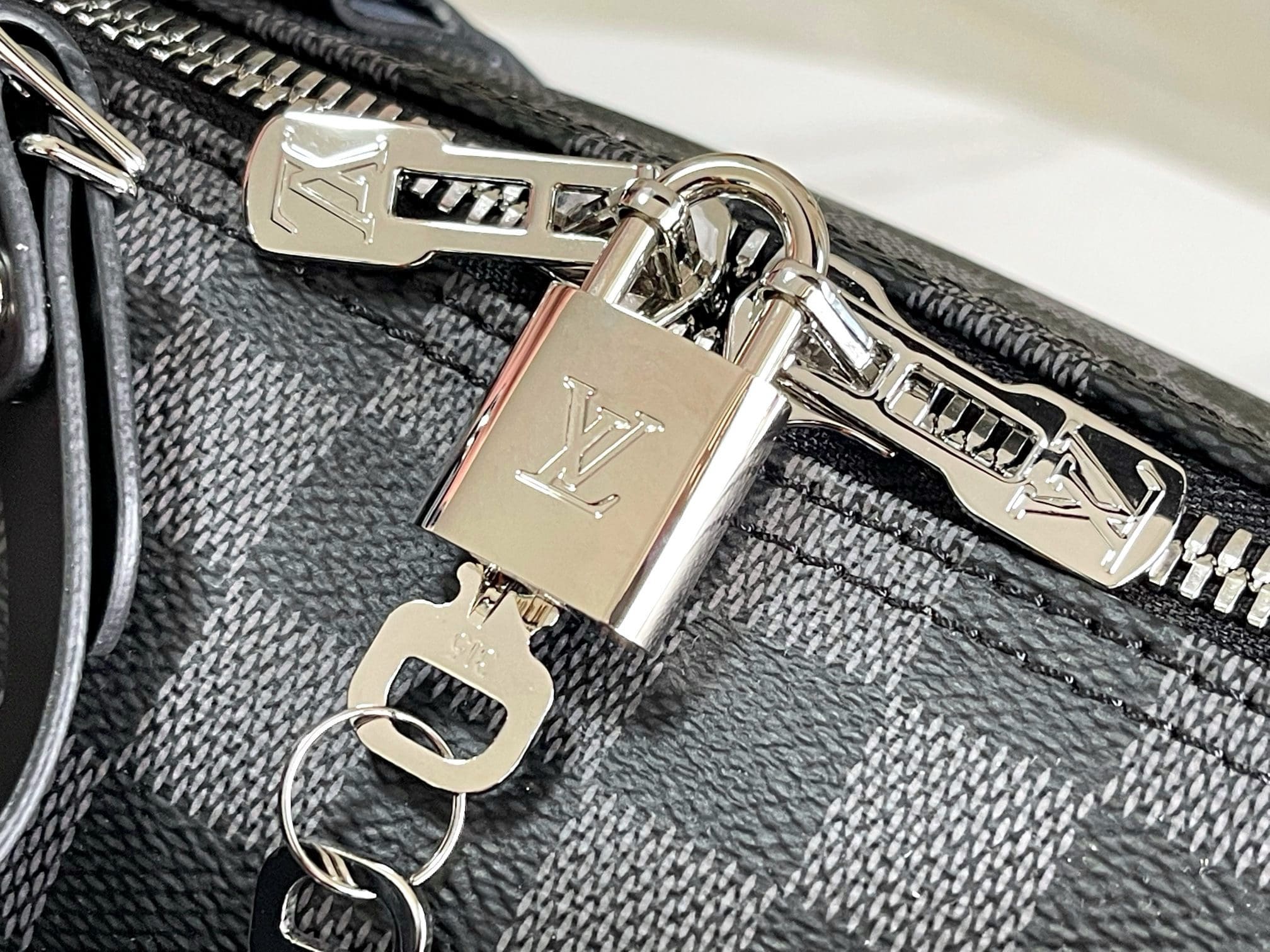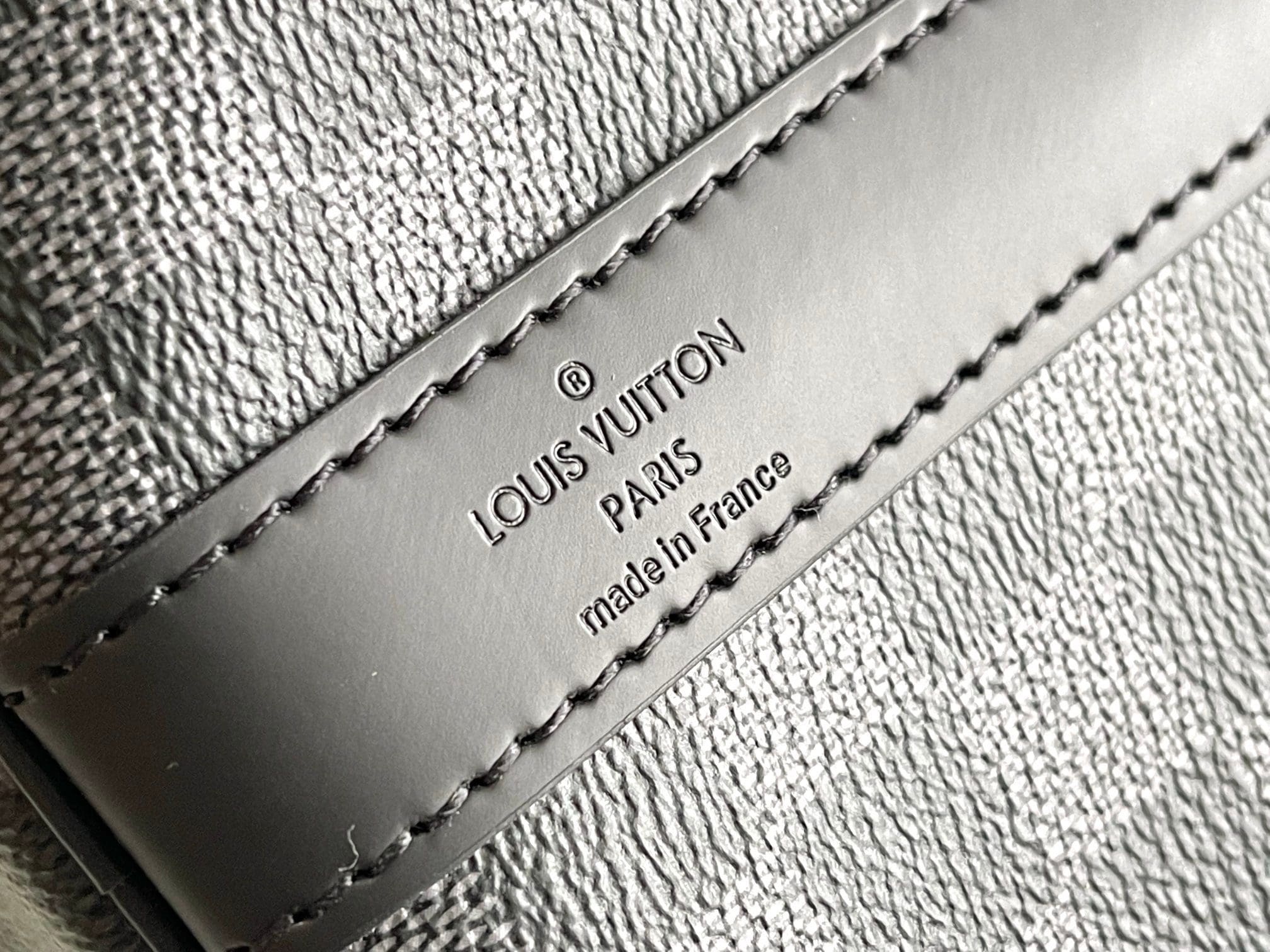 This urban travel bag in a revisited classic, Damier Graphite canvas, is not only stylish but also resistant and light. Hand held with a removable shoulder strap makes it extremely practical to use.