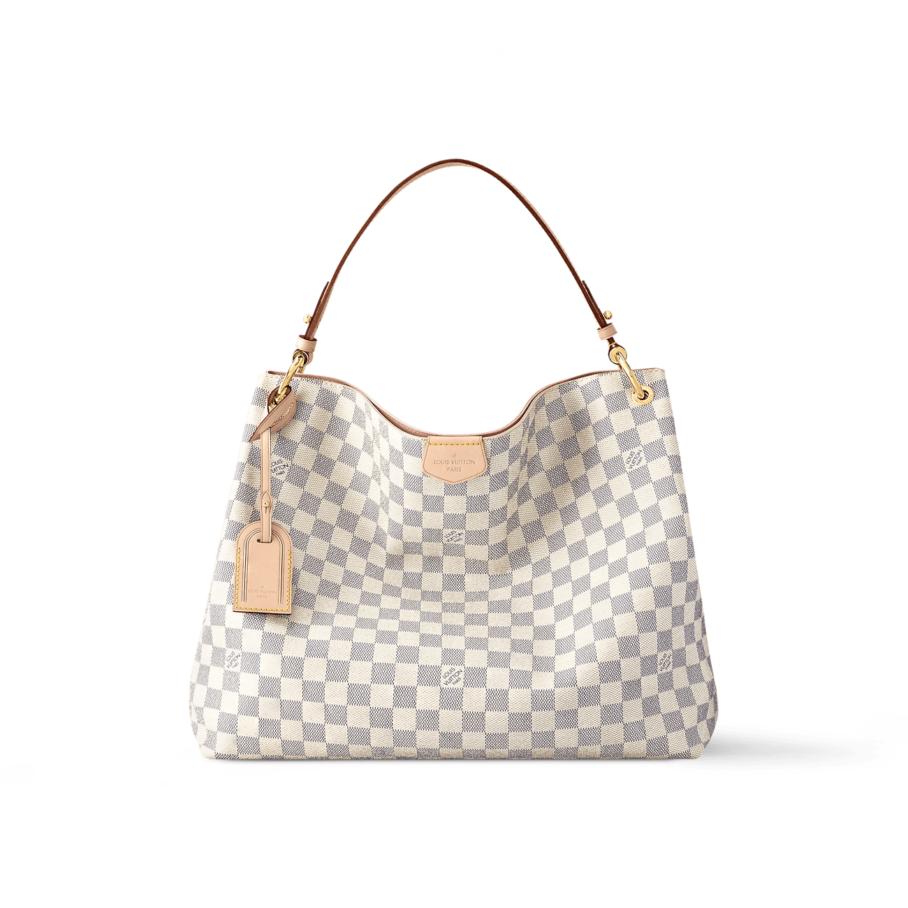 The Graceful PM hobo in fresh Damier Azur canvas is a lightweight, roomy bag to carry every day. Natural cowhide leather detailing and golden hardware add a refined touch. The body-friendly design combines with a supple, flat handle for stylish and comfortable over-the-shoulder wear. The magnetic closure and zipped inside pocket keep belongings secure.