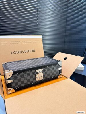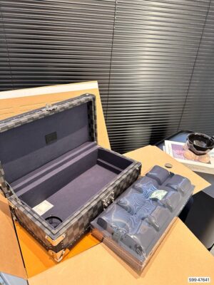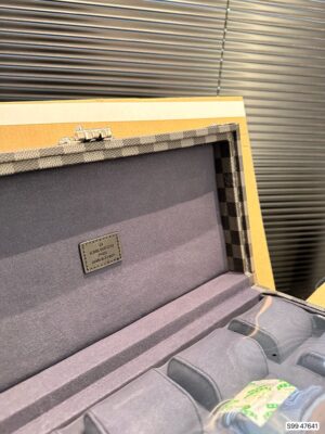 This 8 watch case is crafted in classic Damier Garphite canvas. It easily goes from safe to suitcase and has a removable tray to hide other valuables.