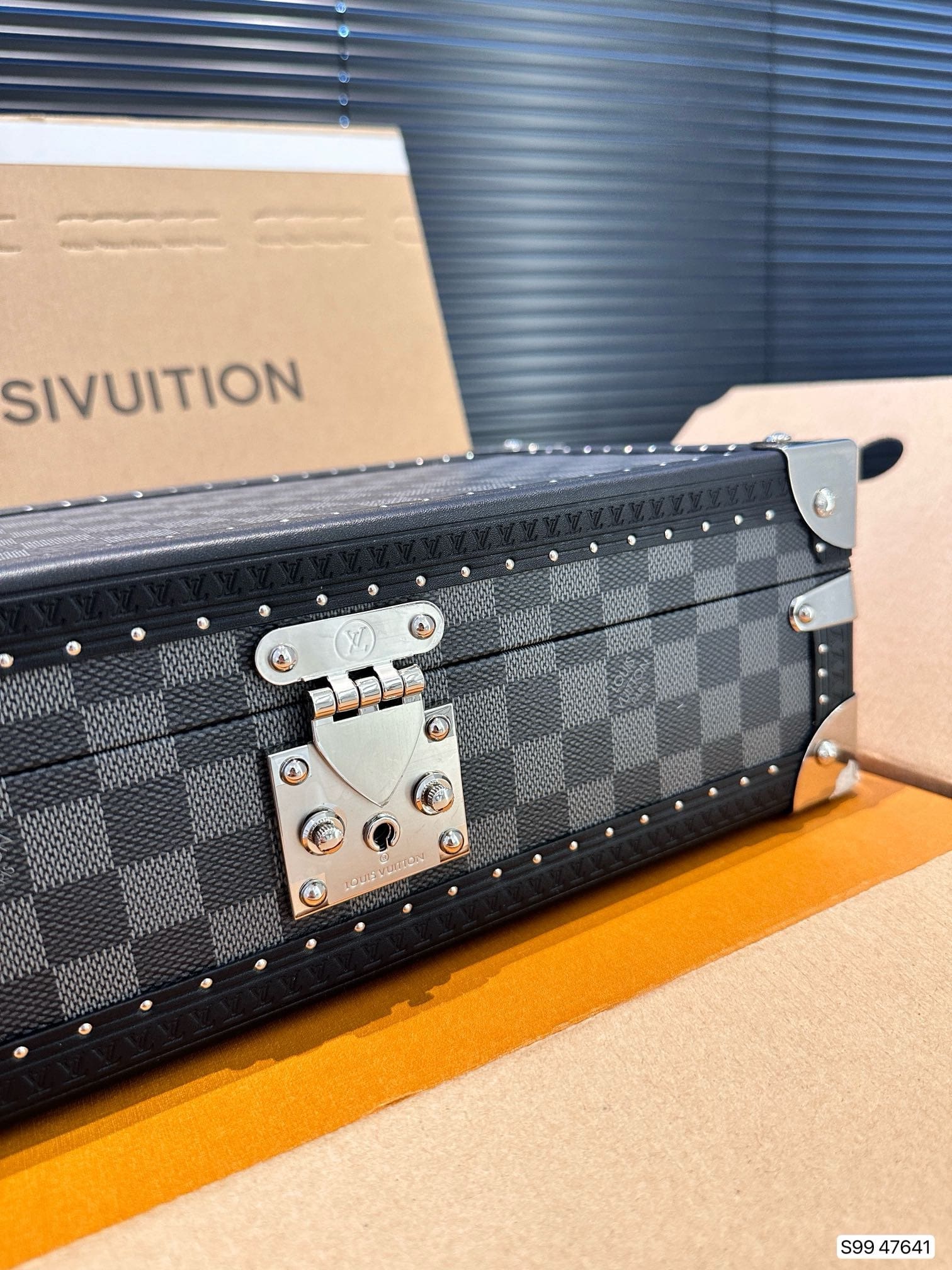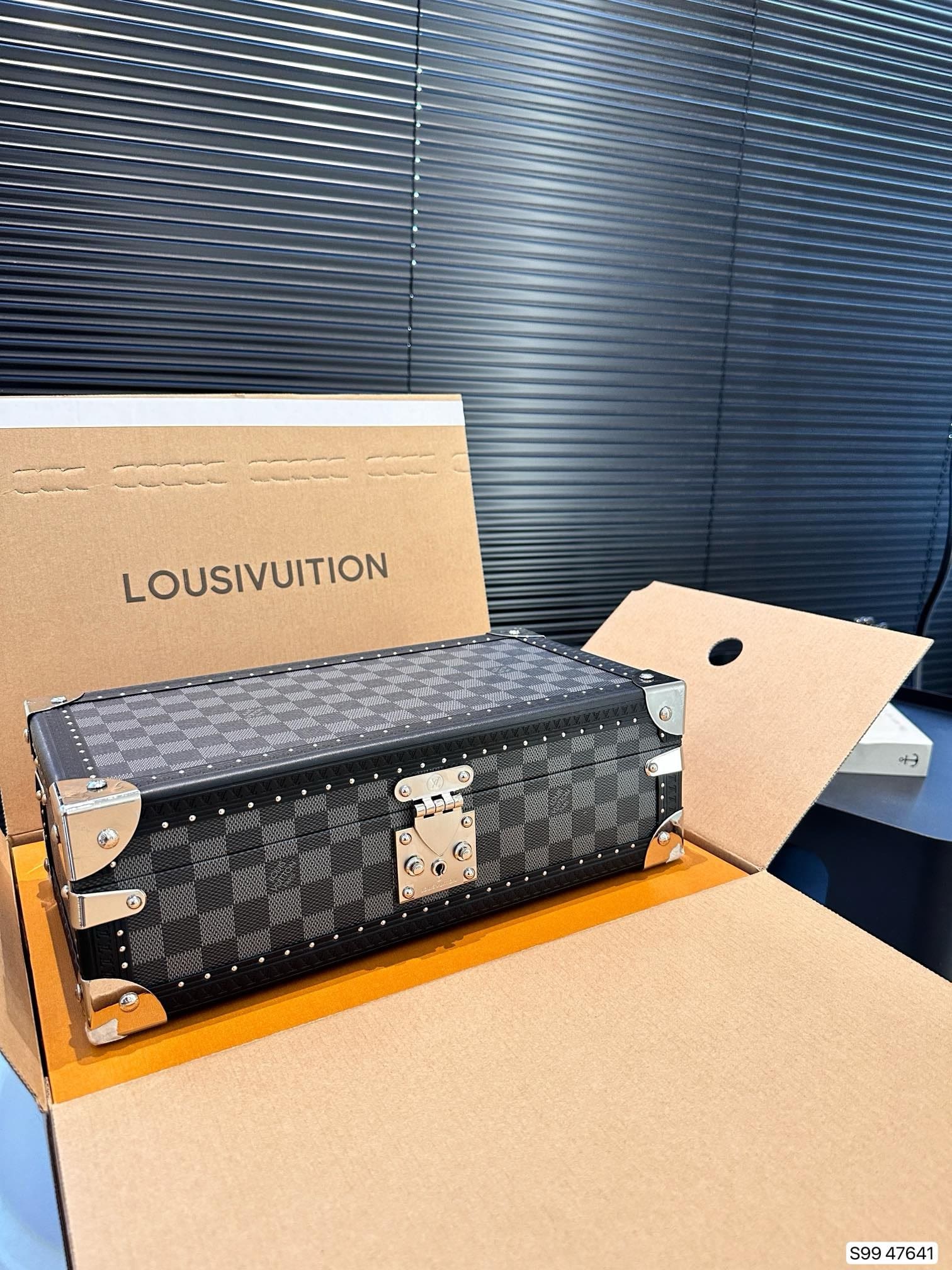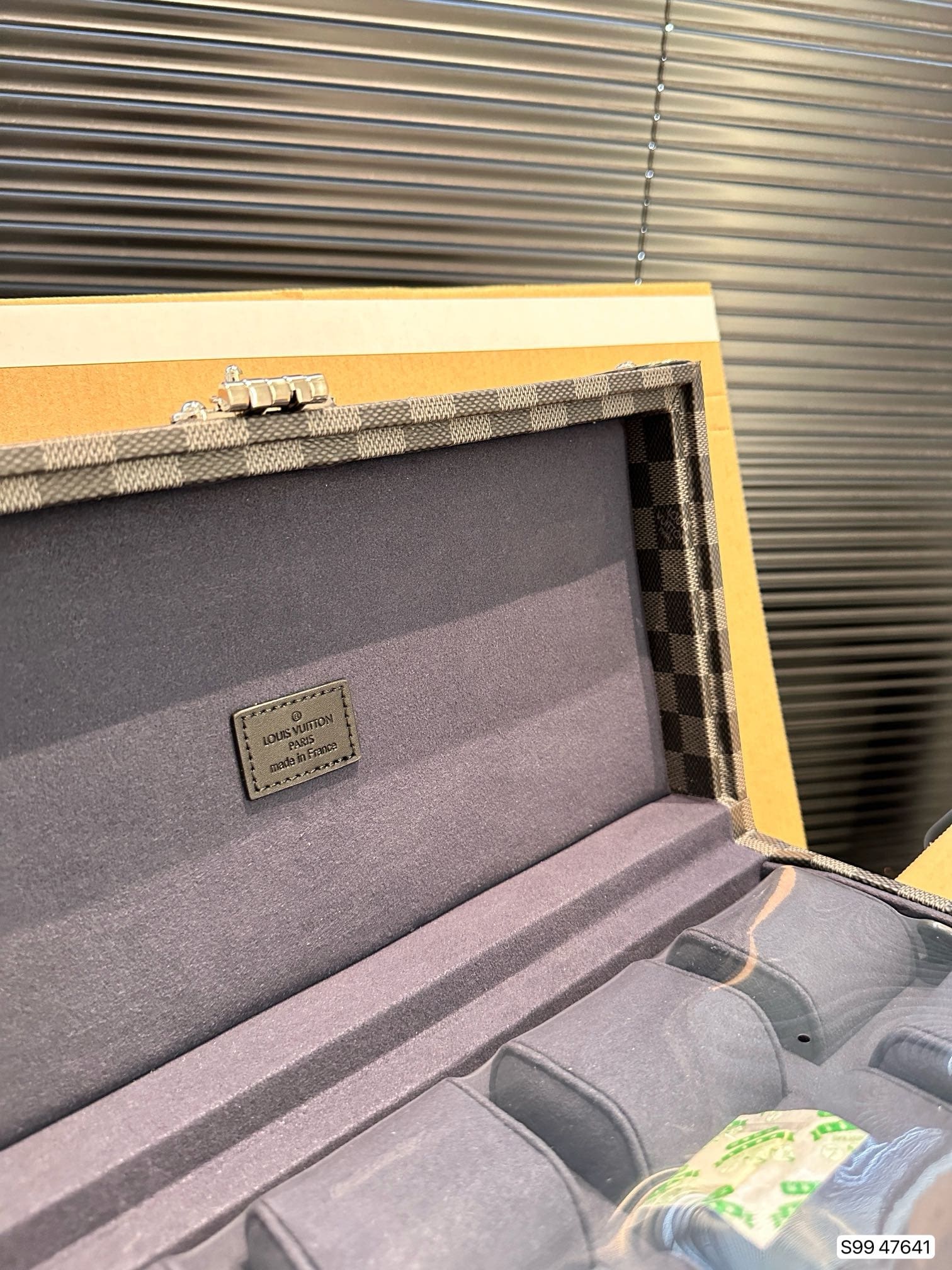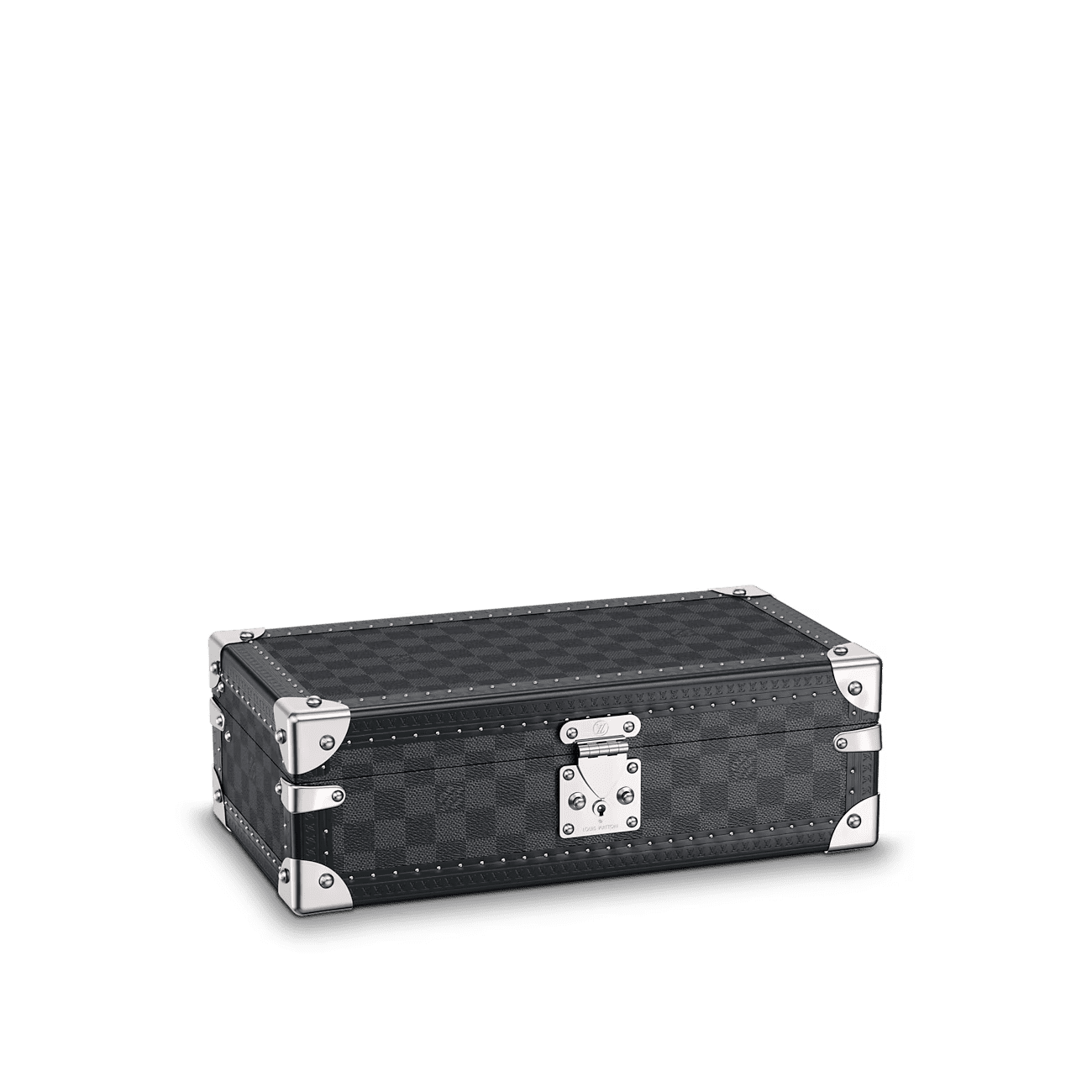 This 8 watch case is crafted in classic Damier Garphite canvas. It easily goes from safe to suitcase and has a removable tray to hide other valuables.