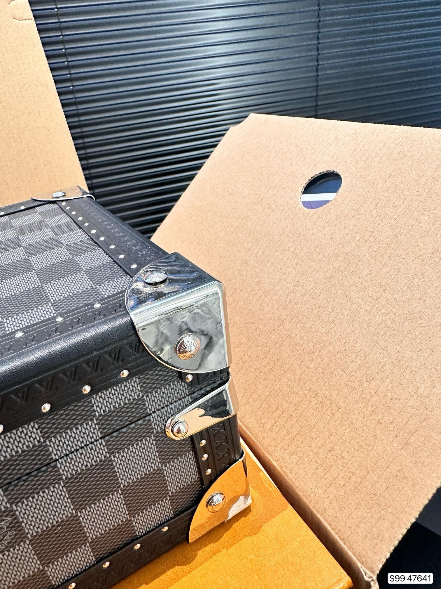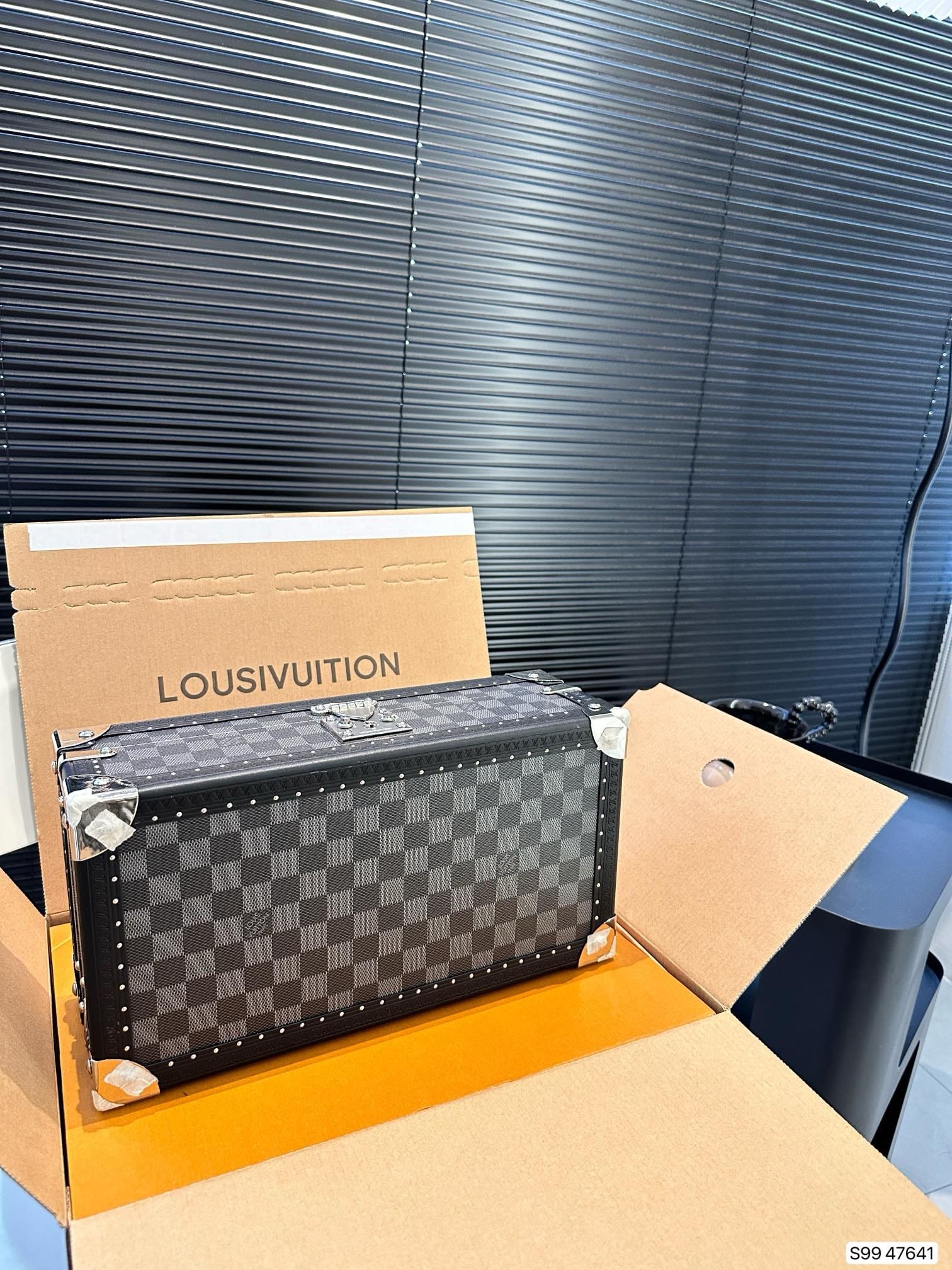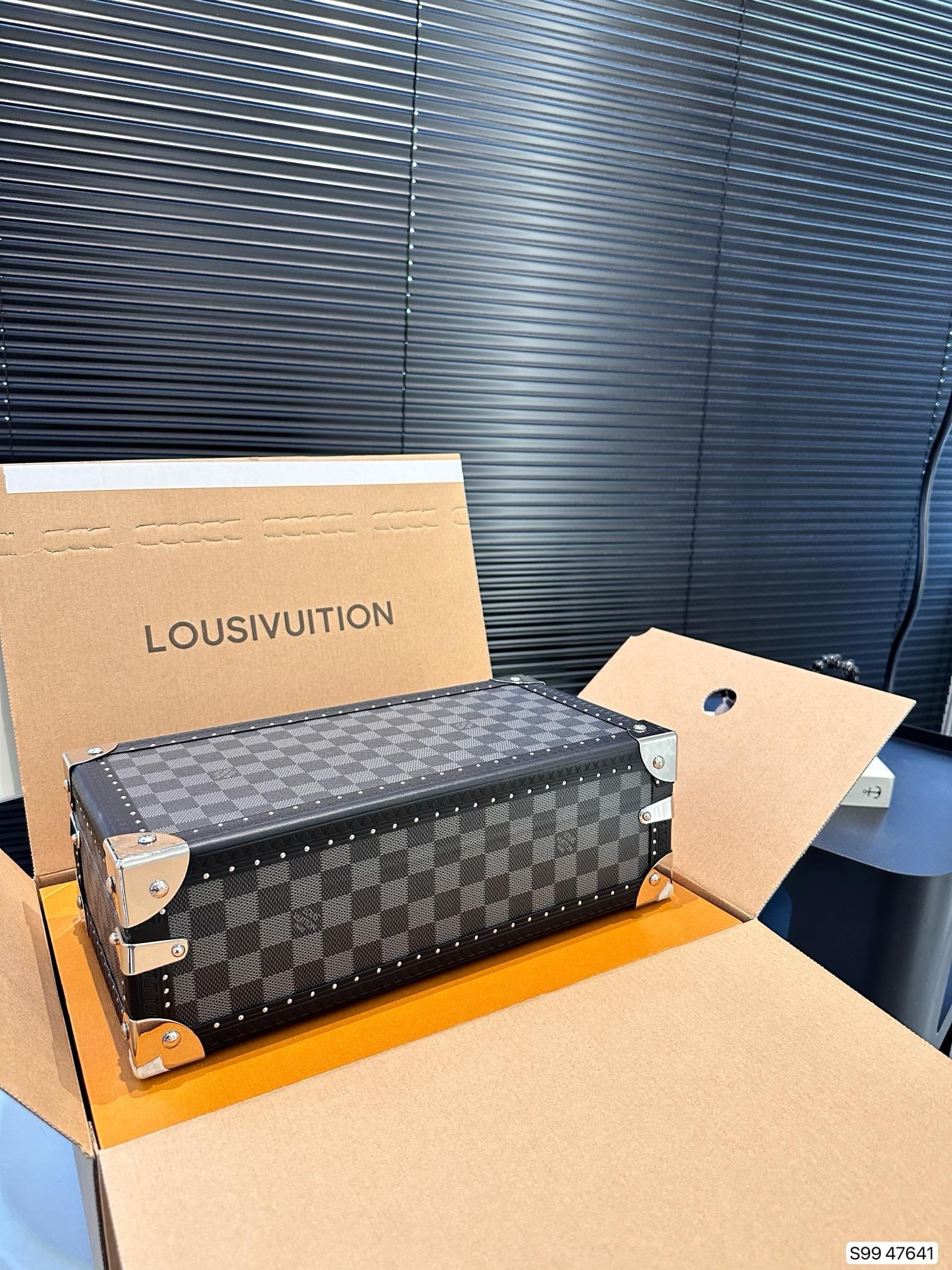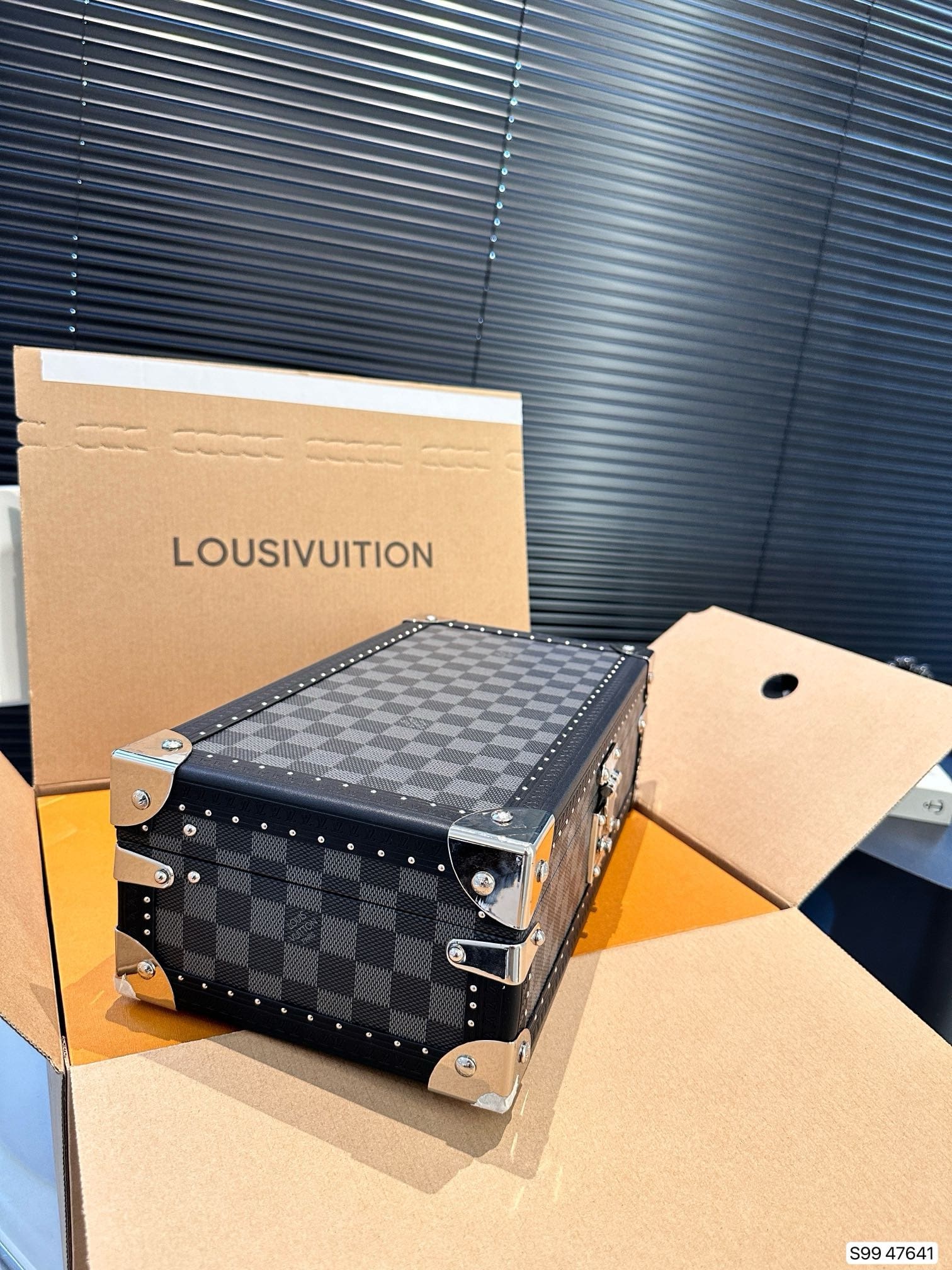 This 8 watch case is crafted in classic Damier Garphite canvas. It easily goes from safe to suitcase and has a removable tray to hide other valuables.