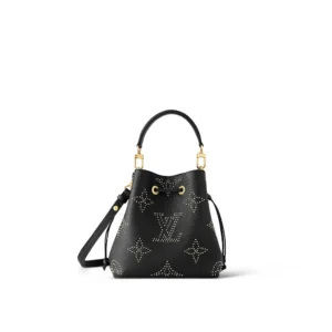 The NéoNoé BB bucket bag features an edgy version of the Monogram pattern formed with studs, each coated with 0.25 microns of gold. This compact bag is just the right size for belongings like a phone, keys, and a wallet. There’s a detachable top handle for hand and elbow carry as well as a removable shoulder strap.