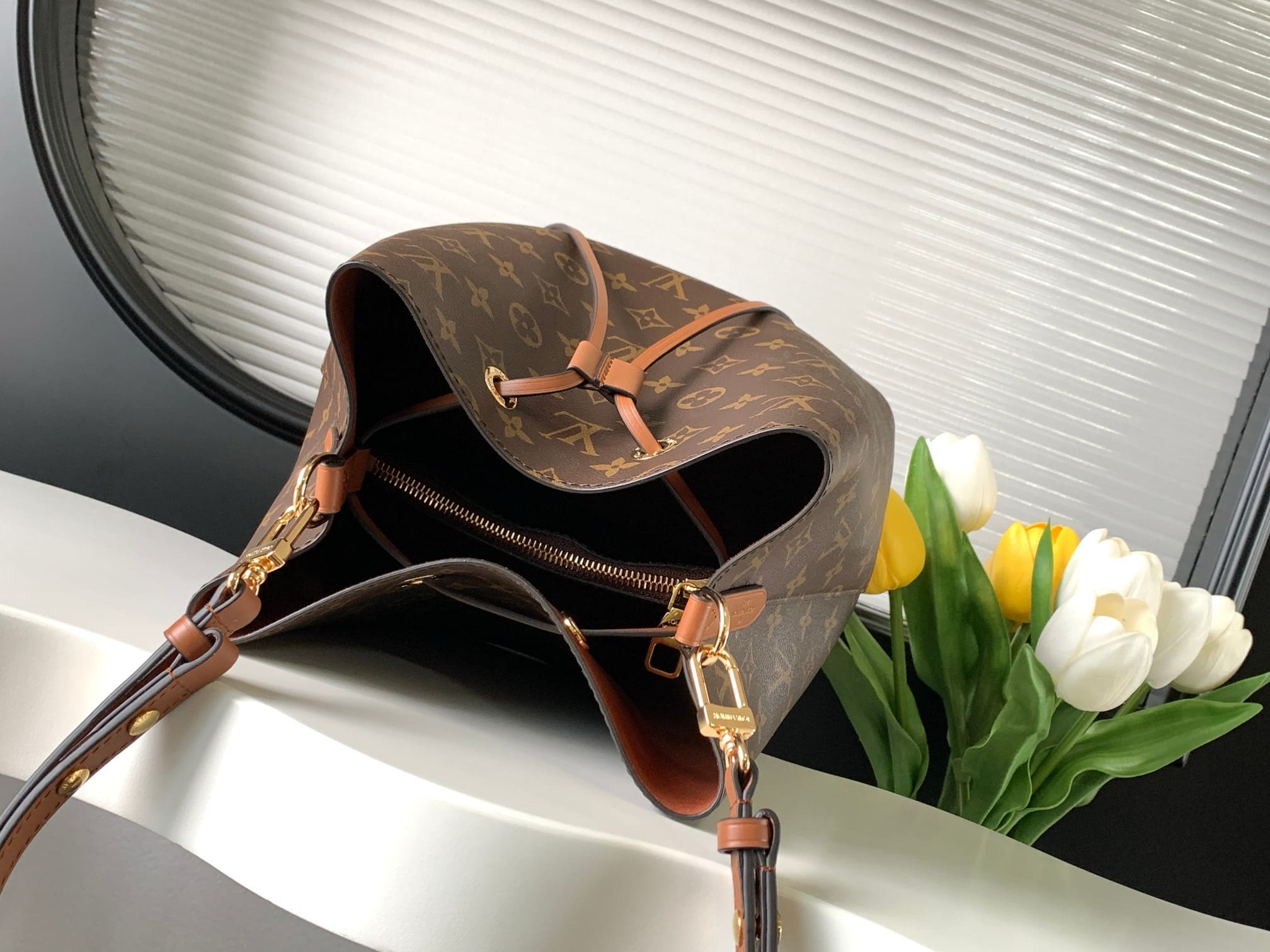 A true House icon, the NéoNoé bucket bag revisits a 1932 design by Gaston-Louis Vuitton. The original was created to transport bottles of Champagne in style; this modern version in Monogram canvas features a sleek shape, colorful leather trim and a matching bonded lining. The adjustable smart strap can be slung over the shoulder or lengthened for a trendy cross-body carry.