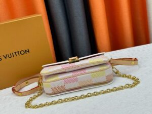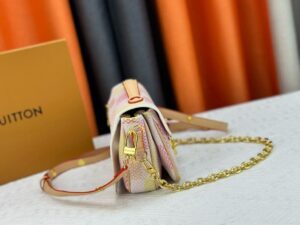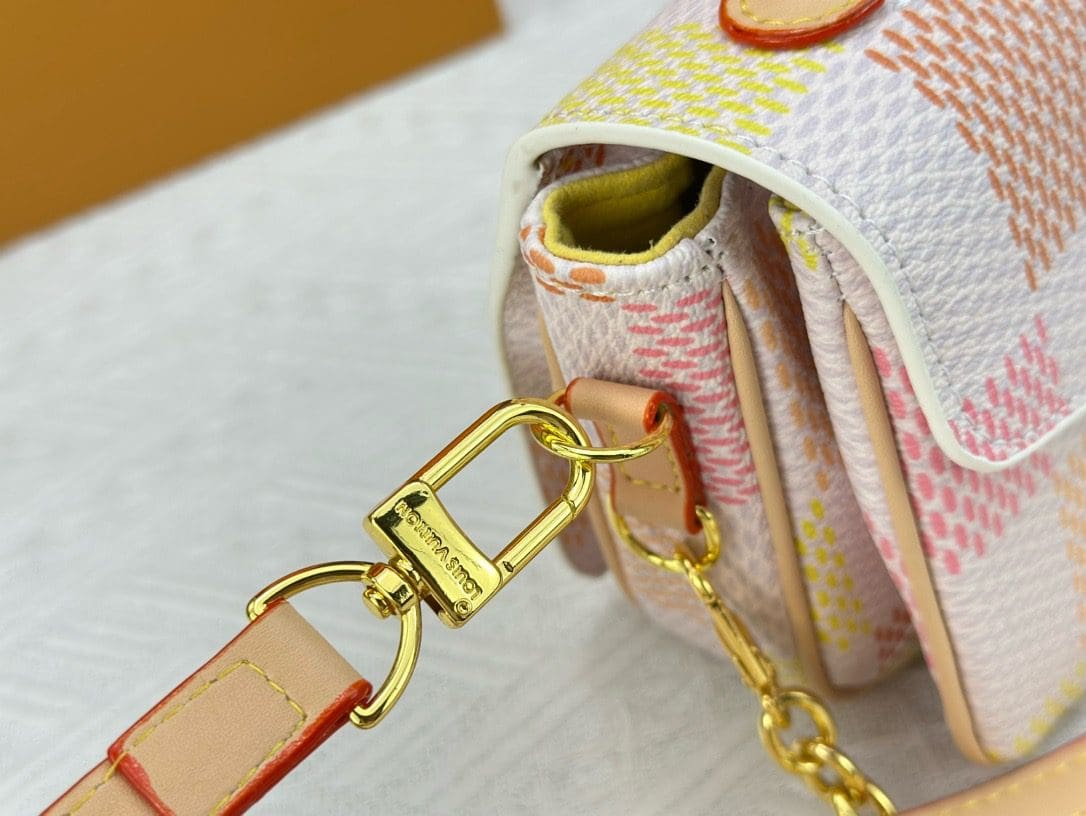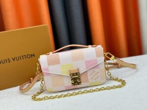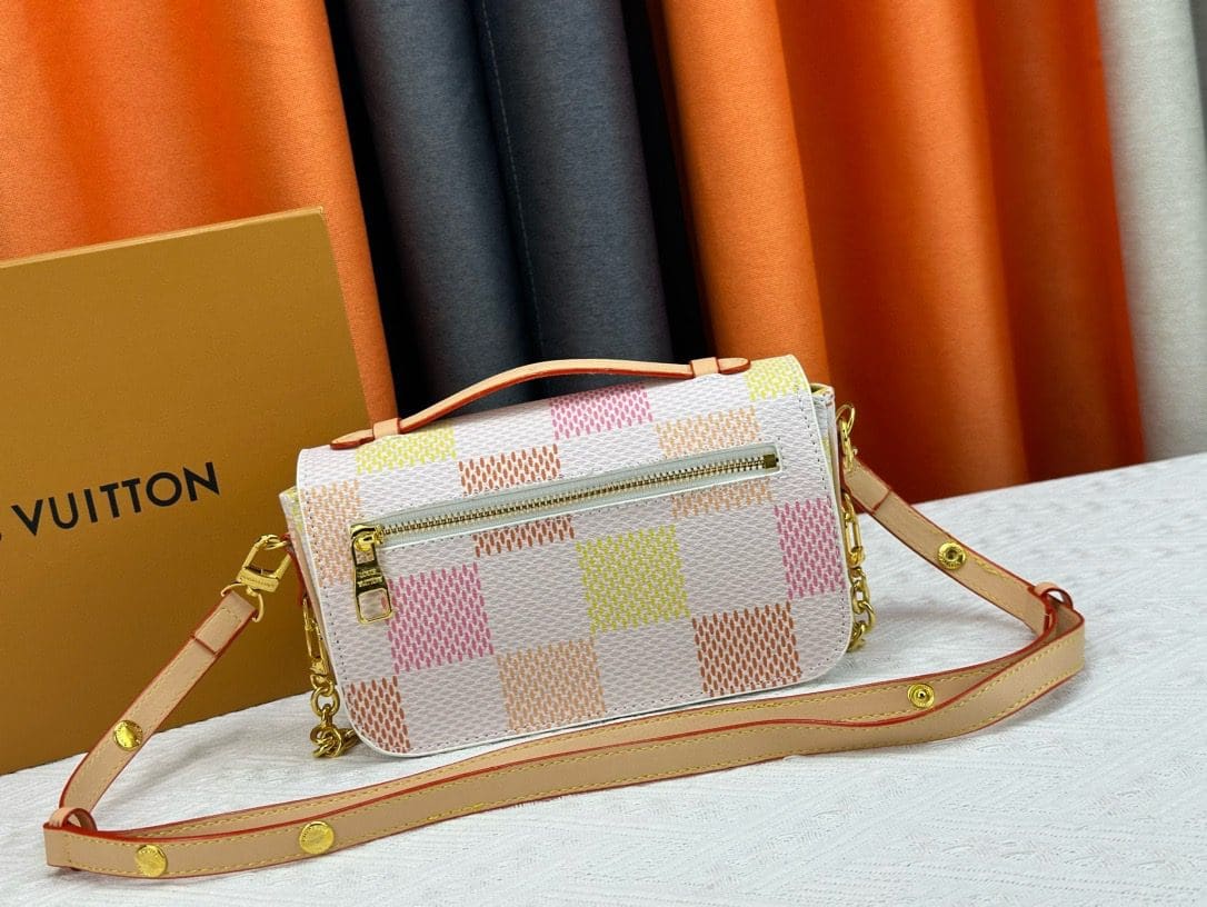 Fashioned from Damier Giant canvas in a pastel colorway, the Pochette Métis East West takes part in the Damierlicious capsule. This stylish shapes features an S-lock and removable short chain, both with a golden finish. The organized interior and the adjustable and removable leather strap make this compact bag perfect for women on the go.