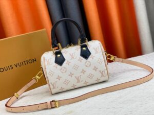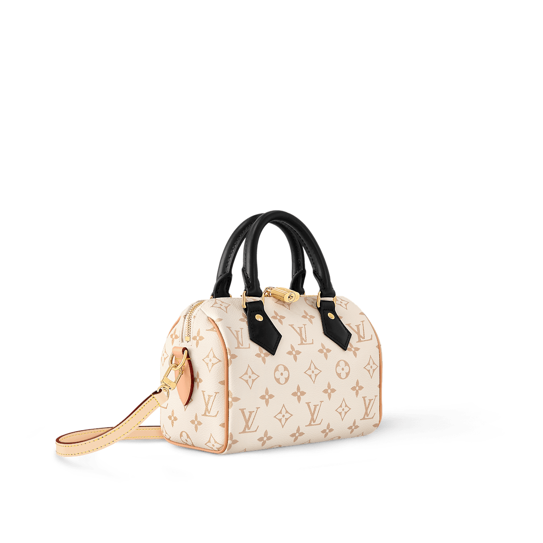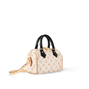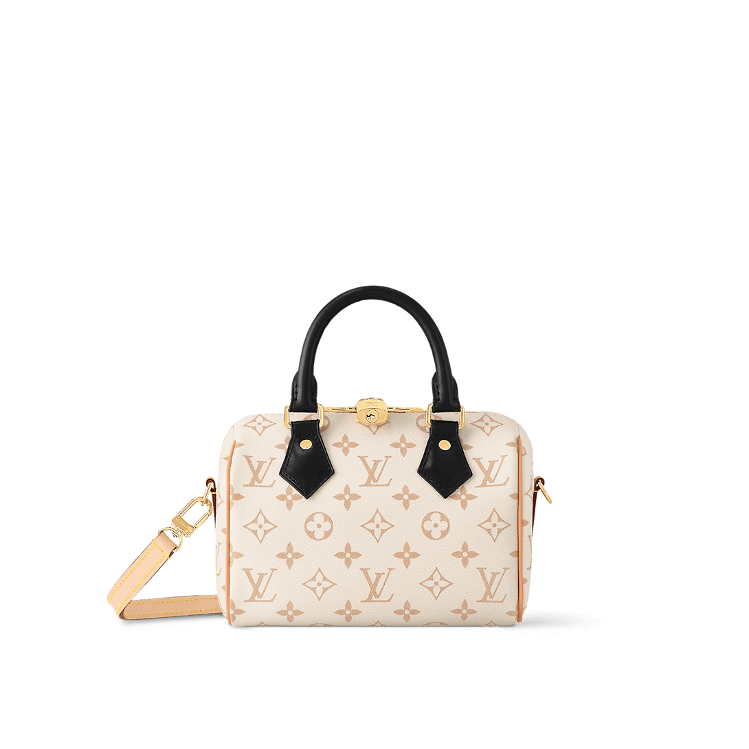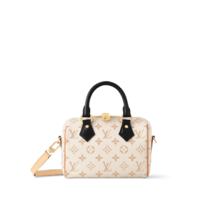 This edition of the iconic Speedy 20 Bandoulière handbag displays the new Monogram Dune canvas, introduced at Cruise 24. Soft yet strong, the sand-inspired colorway is enhanced by Toron handles in black leather and a detachable strap in natural cowhide. Gleaming golden hardware, including a signature padlock, finishes this effortlessly stylish city bag.