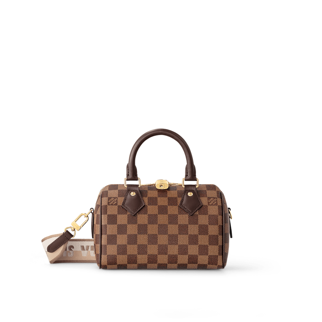 The Speedy Bandoulière 20 city bag is now offered in classic Damier Ebene canvas. Trimmed with chocolate-brown leather and fitted with a beige textile strap, this sporty model is designed for active lifestyles. It accessorizes any silhouette with its instantly recognizable shape, engraved gold-tone padlock and iconic, rolled Toron handles.