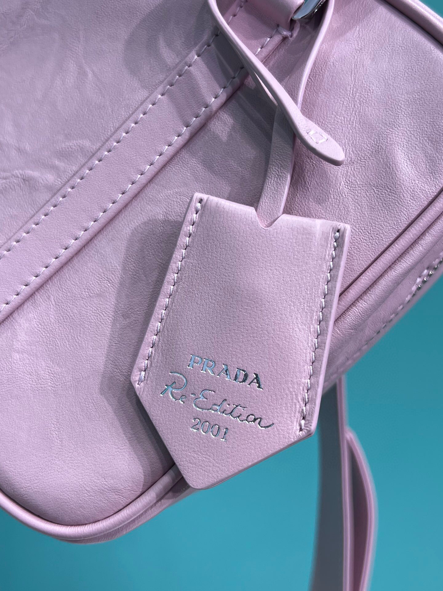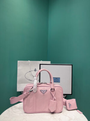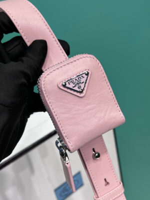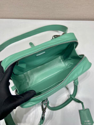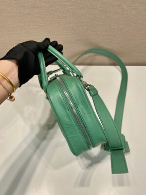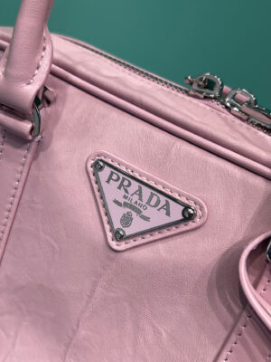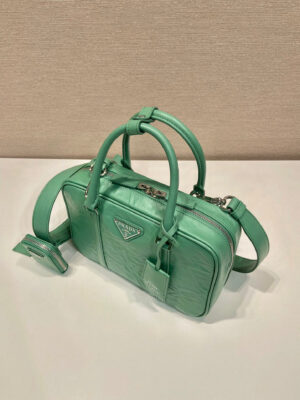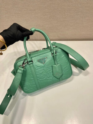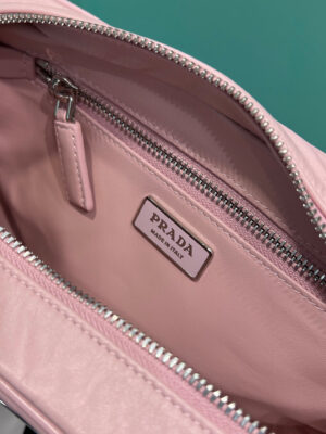 This bag with casual, classic allure is made of glossy nappa with a natural finish. The handmade wrinkled effect contrasts with the concept of a rigid construction, reinterpreting an everyday object that can be worn without constraints. Presented for the Spring Summer 2023 collection, the accessory that is a re-edition of a bag presented in 2001 is decorated with the enameled metal triangle logo.