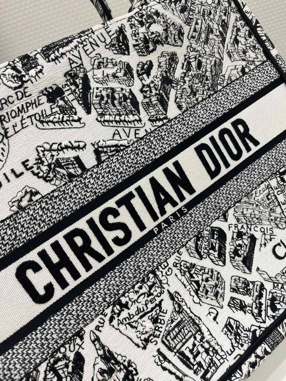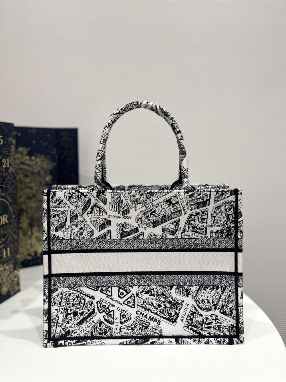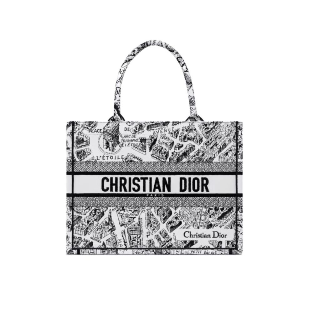 Introduced by Maria Grazia Chiuri, Creative Director of Christian Dior, the Medium Dior Book Tote has become a staple of the Dior aesthetic. Designed to hold all the daily essentials, the style is fully embroidered with the season’s signature white and black Plan de Paris motif, inspired by the House archives and centered around Dior’s historic address on Avenue Montaigne. Adorned with the Christian Dior Paris signature on the front, the medium tote exemplifies the House’s signature savoir-faire and may be carried by hand or worn over the shoulder.