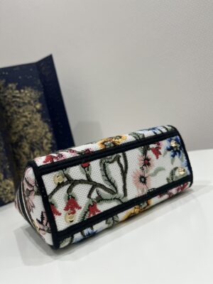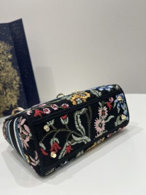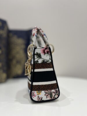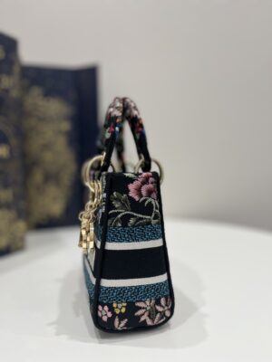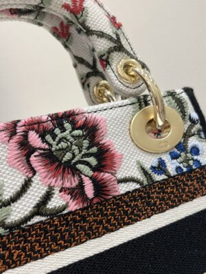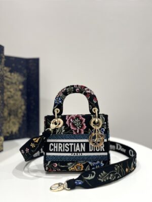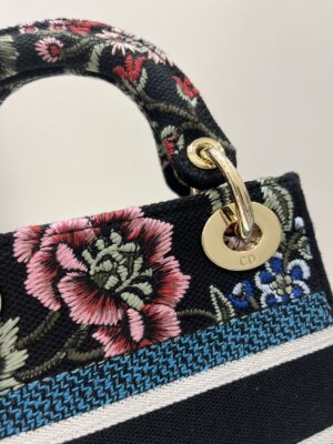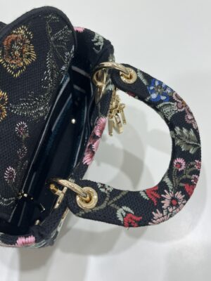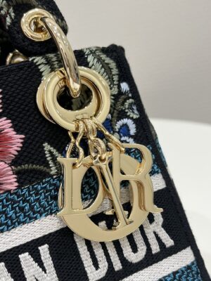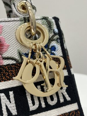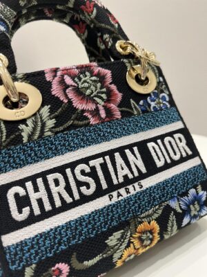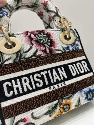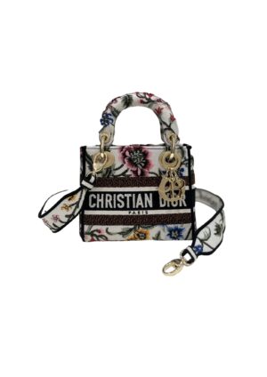 The Mini Lady D-Lite bag combines classic elegance with House modernity. The style is fully embroidered with the multicolor Dior Petites Fleurs motif, a romantic and vibrant homage to Mr. Dior’s passion for florals. A Christian Dior Paris signature adorns the front, while D.I.O.R. charms in pale gold-finish metal further enhance and highlight the silhouette. Featuring a wide embroidered shoulder strap, the miniature Lady D-Lite bag can be carried by hand, worn over the shoulder or crossbody.
