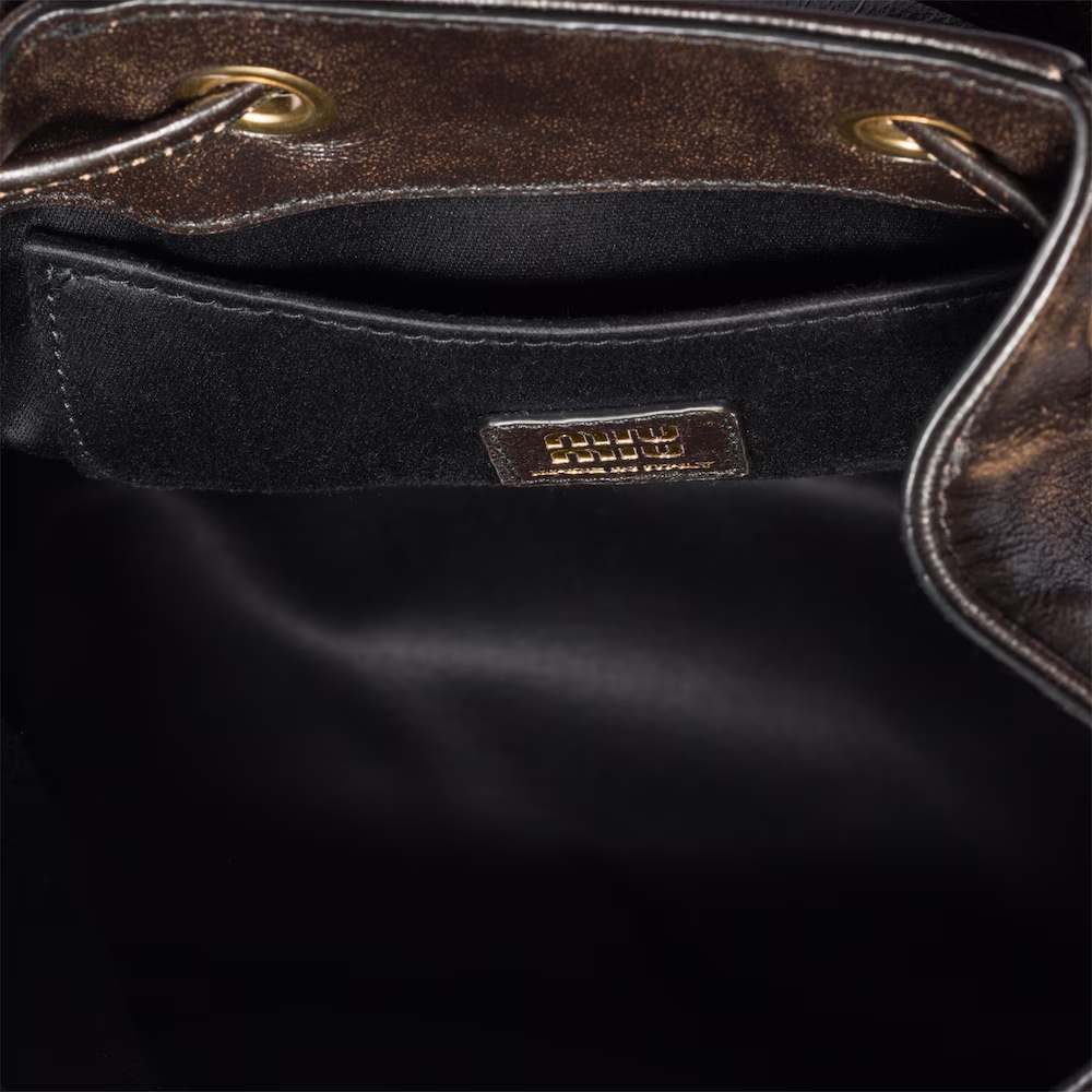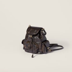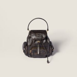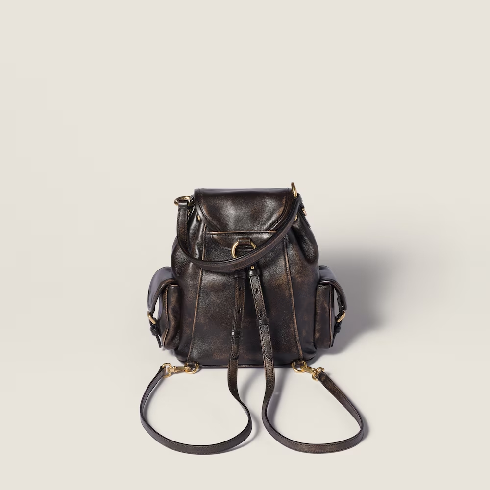 This backpack inspired by school gear combines the vintage charm of aged leather and artisanal appeal. The multi-pocket design and option of wearing it as a crossbody bag reflect the contemporary and playful spirit of Miu Miu bags.