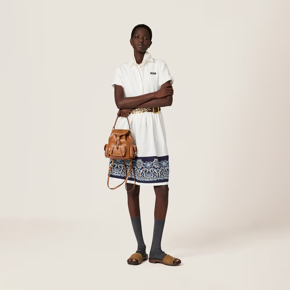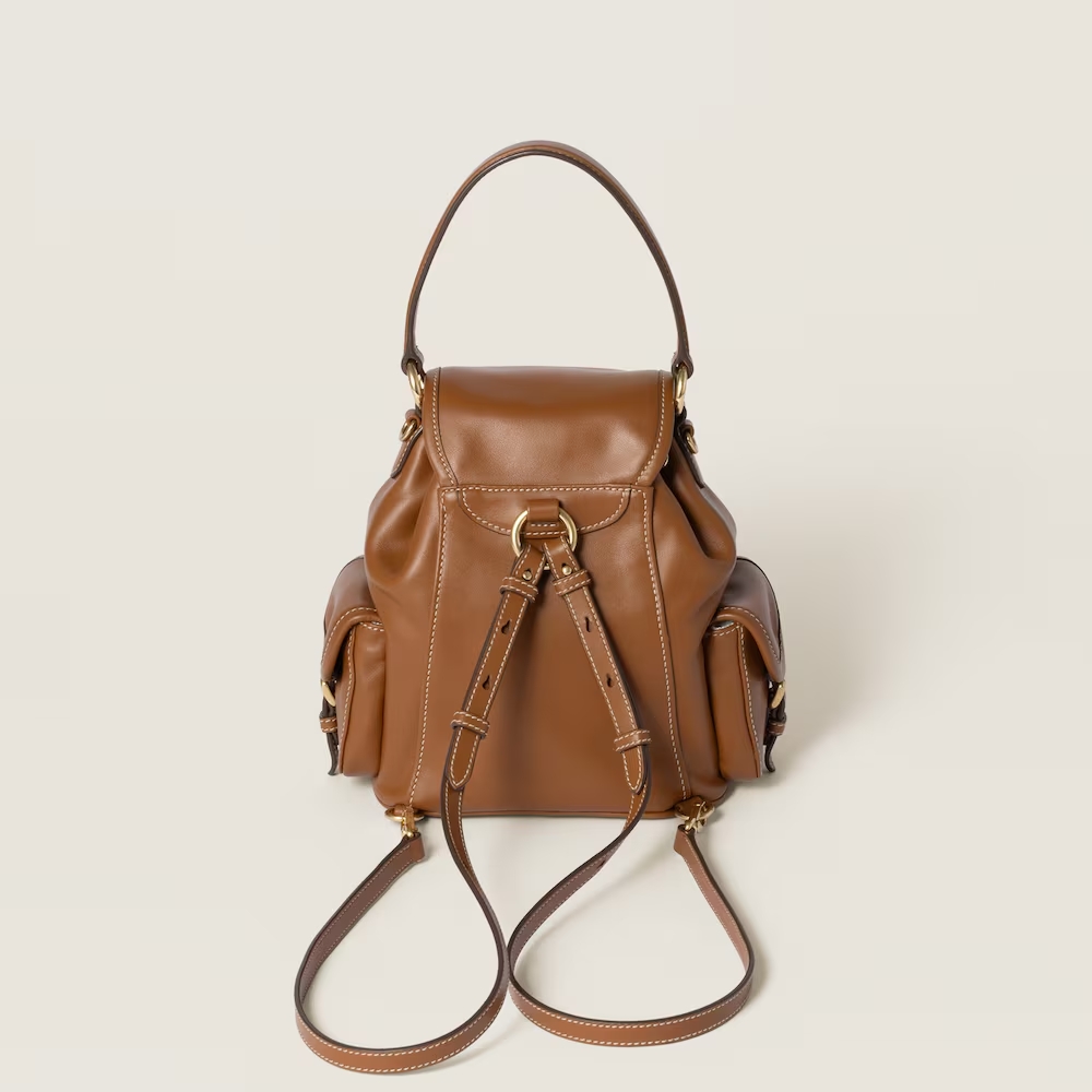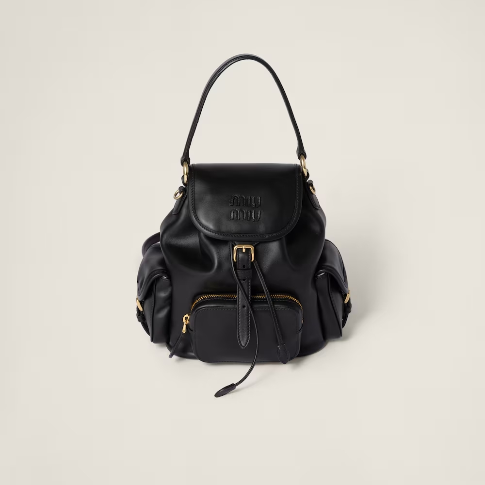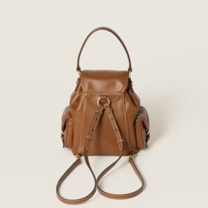 This leather backpack inspired by school gear combines artisan appeal and a casual attitude. The multi-pocket design and the option of wearing it as a crossbody bag express the contemporary and playful spirit of Miu Miu bags.