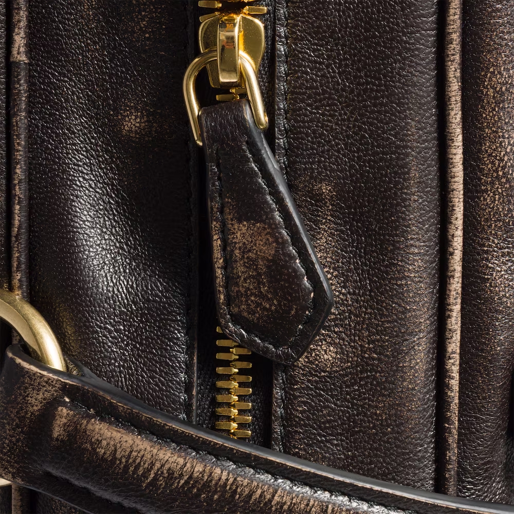 The top-handle style reinterprets the iconic lines of the Pocket back in a larger version enriched with an aged treatment of the nappa leather that enhances the distinctive multi-pocket design and its functional spirit.