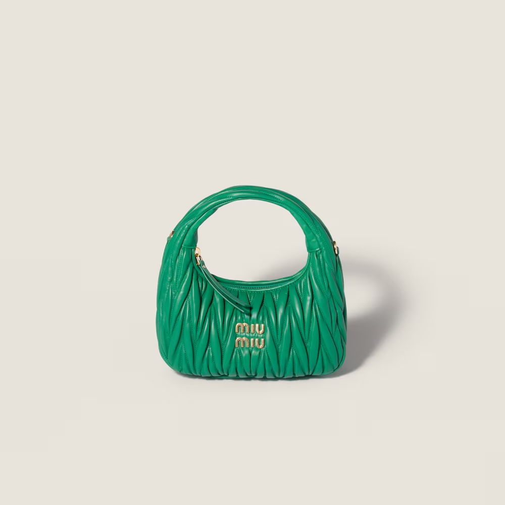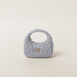 The Wander bag is reinterpreted season after season, becoming an iconic accessory of Miu Miu collections. Made of matelassé nappa leather, the bag is characterized by the sophisticated, three-dimensional effect created by the refined workmanship. The hobo shape, blending retro inspirations and contemporary elegance, becomes a new synonym of modern femininity.
