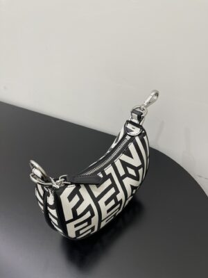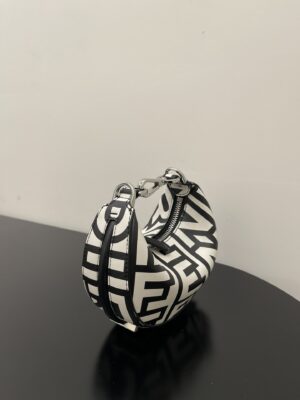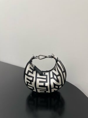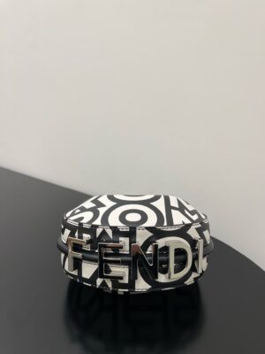 Nano Fendigraphy Hobo Bag with zip closure, embellished with coloured metal FENDI lettering. The adjustable strap with a clip allows it to be attached to larger bags or worn on the wrist. Comes with hooks for the shoulder strap. Made of printed with the Fendi Roma logo in white and black, reinterpreted by Marc Jacobs in an all-over, oversize style. finish metalware. Embellished with the exclusive Fendi Roma Marc Jacobs New York City label.