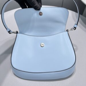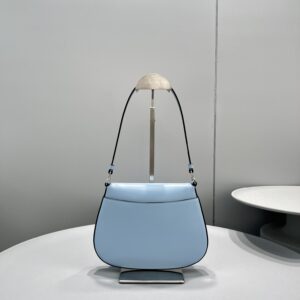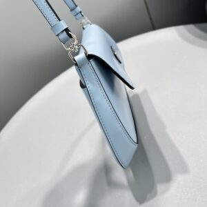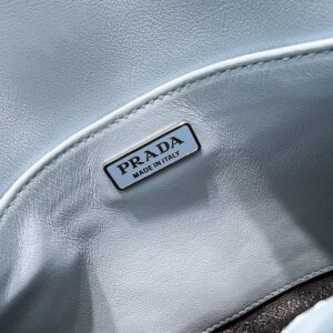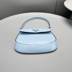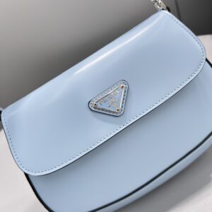 The Prada Cleo bag with sophisticated allure reinterprets an iconic design of the brand from the 1990’s. Sleek curved lines emphasized by the particular construction rounded on the bottom and sides give this flap bag a soft, light look. Brushed , a modern and versatile material that is distinctive in Prada collections, is ideal for creating always new combinations and contrasts. The enamel triangle logo decorates the silhouette.