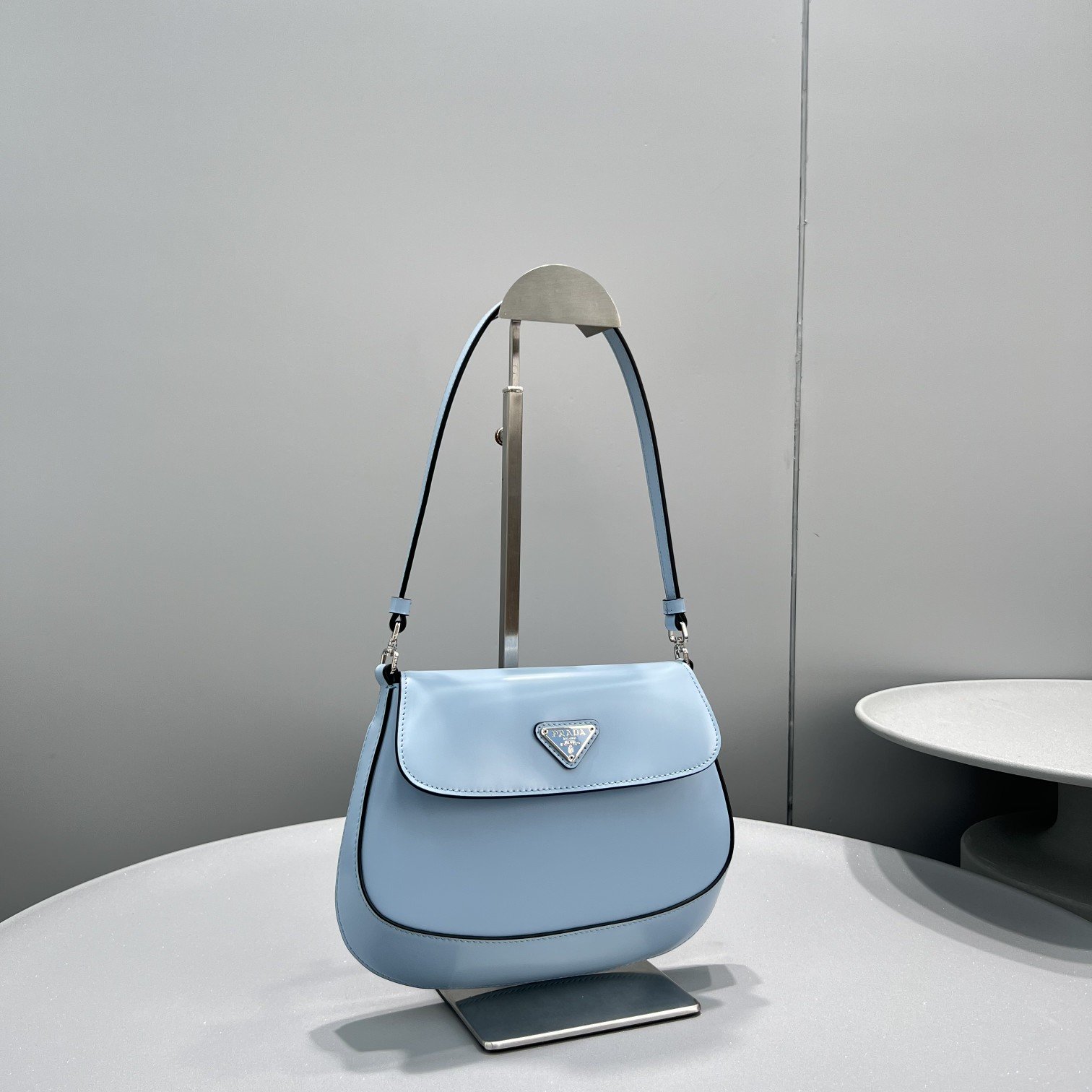 The Prada Cleo bag with sophisticated allure reinterprets an iconic design of the brand from the 1990’s. Sleek curved lines emphasized by the particular construction rounded on the bottom and sides give this flap bag a soft, light look. Brushed , a modern and versatile material that is distinctive in Prada collections, is ideal for creating always new combinations and contrasts. The enamel triangle logo decorates the silhouette.