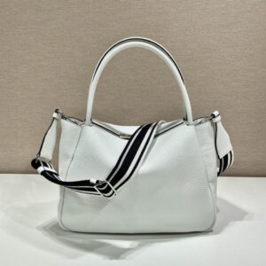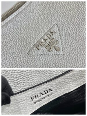The reverse stitching emphasizes the soft, rounded silhouette of this handbag with a versatile detachable woven tape shoulder strap featuring the logo embroidered in a contrasting color. The accessory is decorated with the new interpretation of the triangle formed by stitching with the Prada metal lettering logo gleaming at its center.