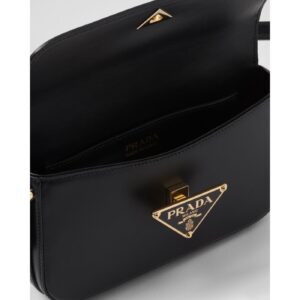 This shoulder bag plays with the concept of simplicity through its lines and compact size, combining versatility and elegance in a refined design. The leather accessory comes with an adjustable shoulder strap and is embellished with metal hardware like the iconic triangle logo that adorns the clasp on the front.