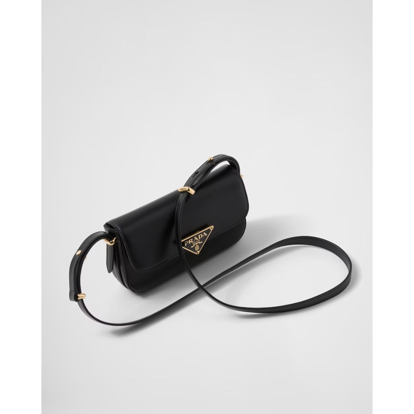 This shoulder bag plays with the concept of simplicity through its lines and compact size, combining versatility and elegance in a refined design. The leather accessory comes with an adjustable shoulder strap and is embellished with metal hardware like the iconic triangle logo that adorns the clasp on the front.