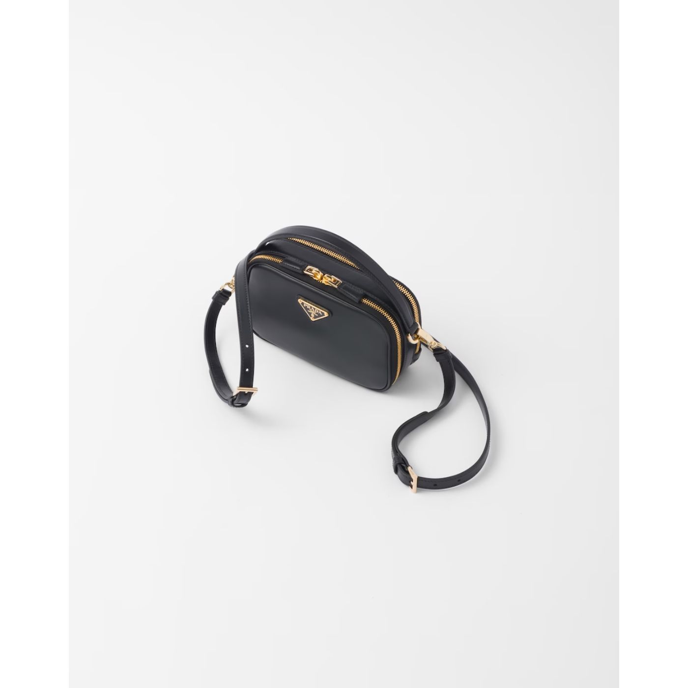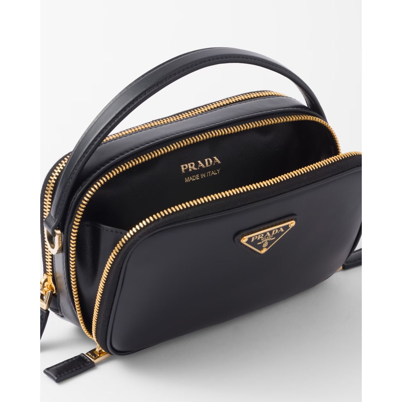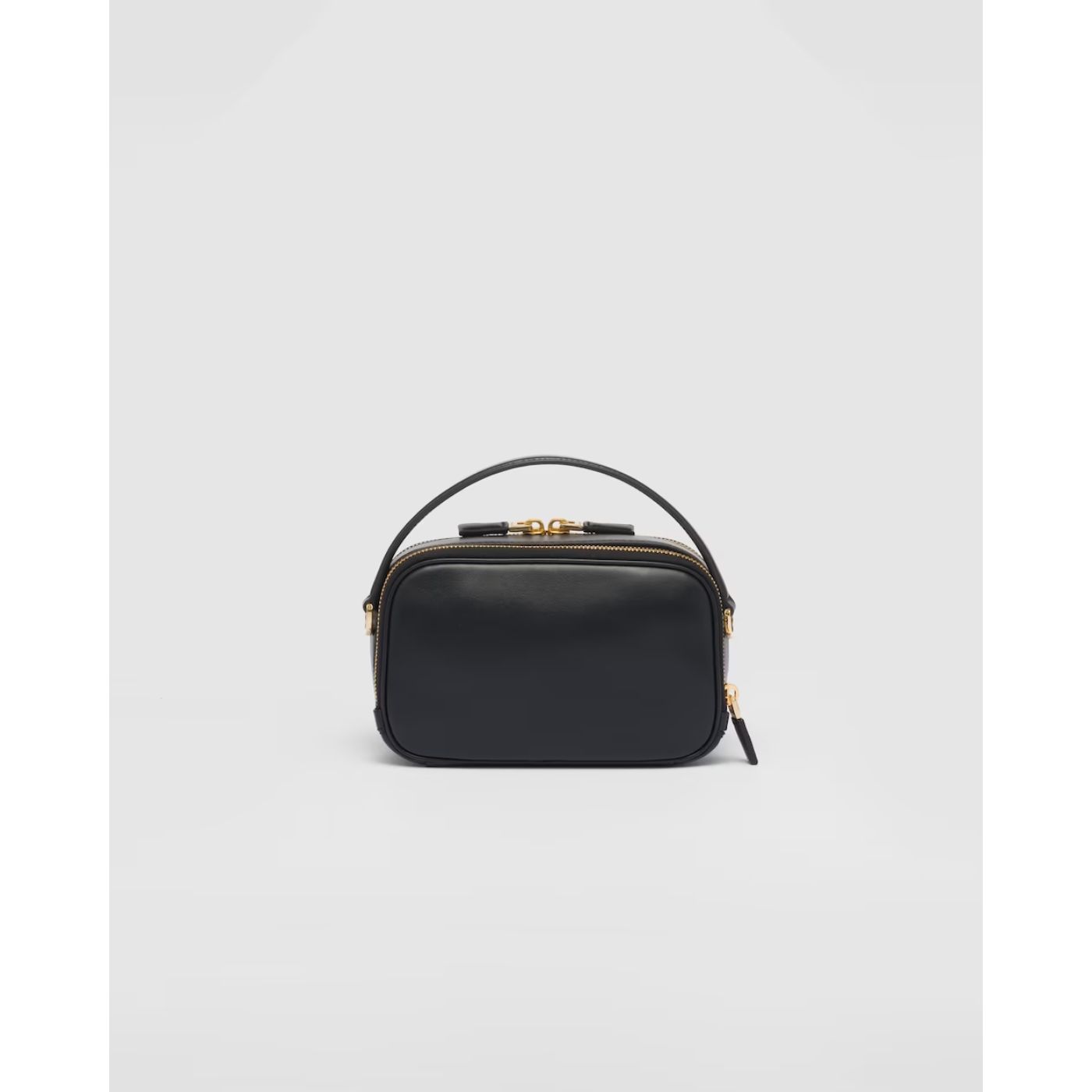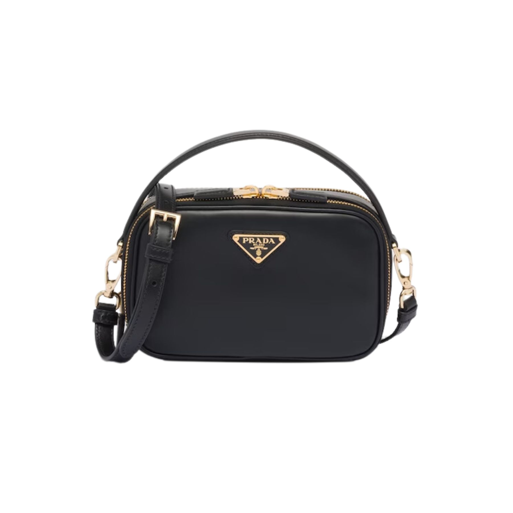 Elegance and sleek lines give life to a leather mini-bag with a refined character. The versatile, structured design, carried by hand or worn with the detachable shoulder strap, is completed with a double zipper closure and embellished with the enameled metal triangle logo.
