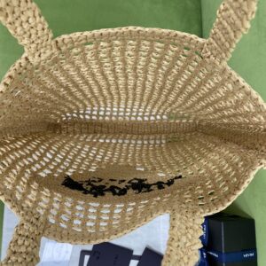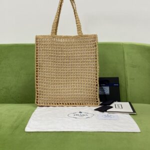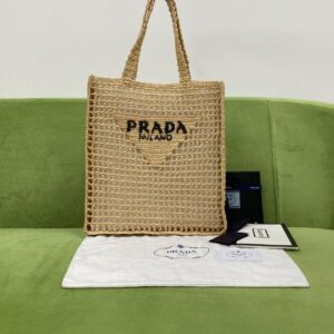 This tote bag with a soft, deconstructed design is made of raffia, a material of natural origin imbued with a summery mood. A new interpretation of the emblematic Prada triangle decorates the front and is embellished with the embroidered lettering logo at the center.