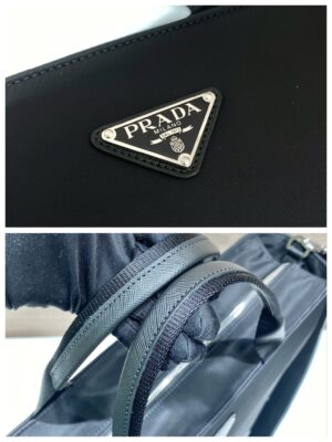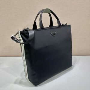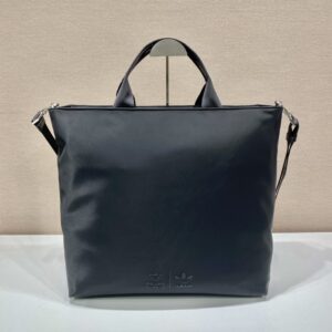 Sporty and versatile, this shopping bag is inspired by the iconic heritage and aesthetic code of both brands. Also reworked adidas’ trademark three stripes into Saffiano . An iconic Prada material defined by a crisscross texture. Handcrafted accessories from Re-Nylon. An innovative fabric produced from recycled and purified plastic collected in the ocean.