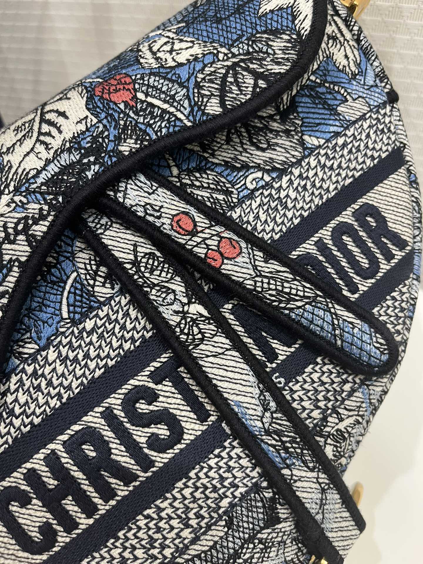 Maria Grazia Chiuri brings a fresh update to the iconic Saddle bag. Fully embroidered with the denim multicolor Dior Jardin Magique motif, the bag reveals a bucolic and enchanting design, inspired by a magical world. The legendary bag features a Saddle flap with a magnetic ‘D’ stirrup clasp and boasts an antique gold-finish metal ‘CD’ signature on each side of the handle. The bag can be carried by hand or worn over the shoulder and may be customized with different shoulder straps.