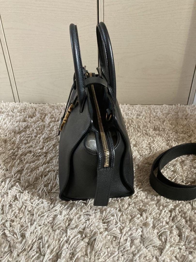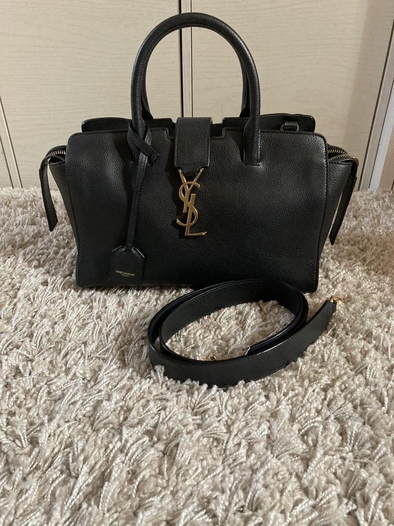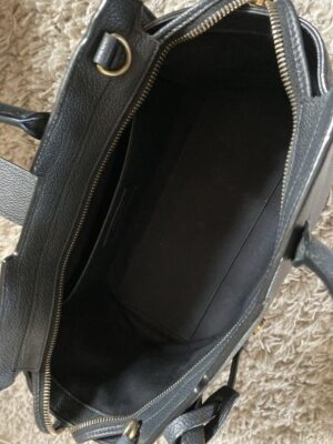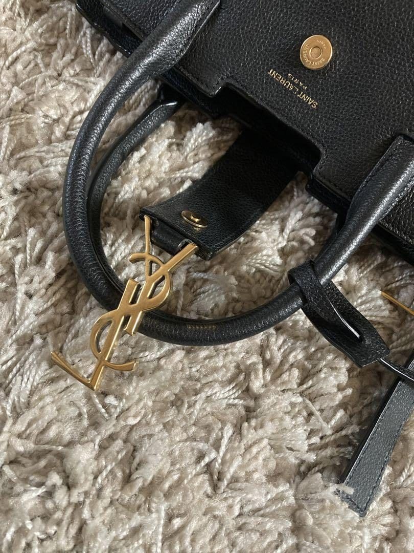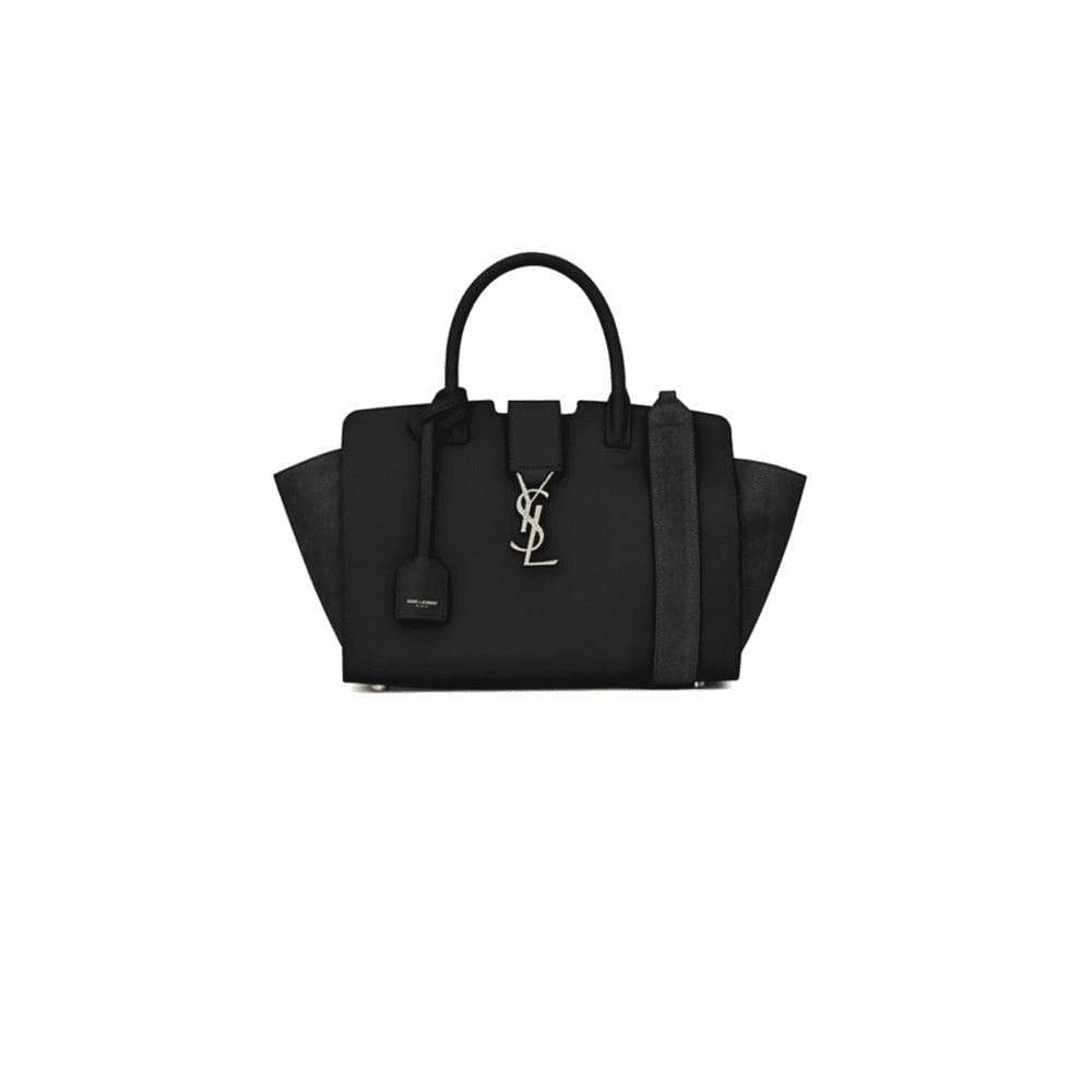 TUBULAR TOP HANDLE MONOGRAM SAINT LAURENT BAG WITH EXPANDABLE GUSSETED SIDE PANELS, LEATHER ENCASED KEY RING, INTERLOCKING YSL SIGNATURE BUCKLE CLOSURE AND REMOVABLE SHOULDER STRAP.
