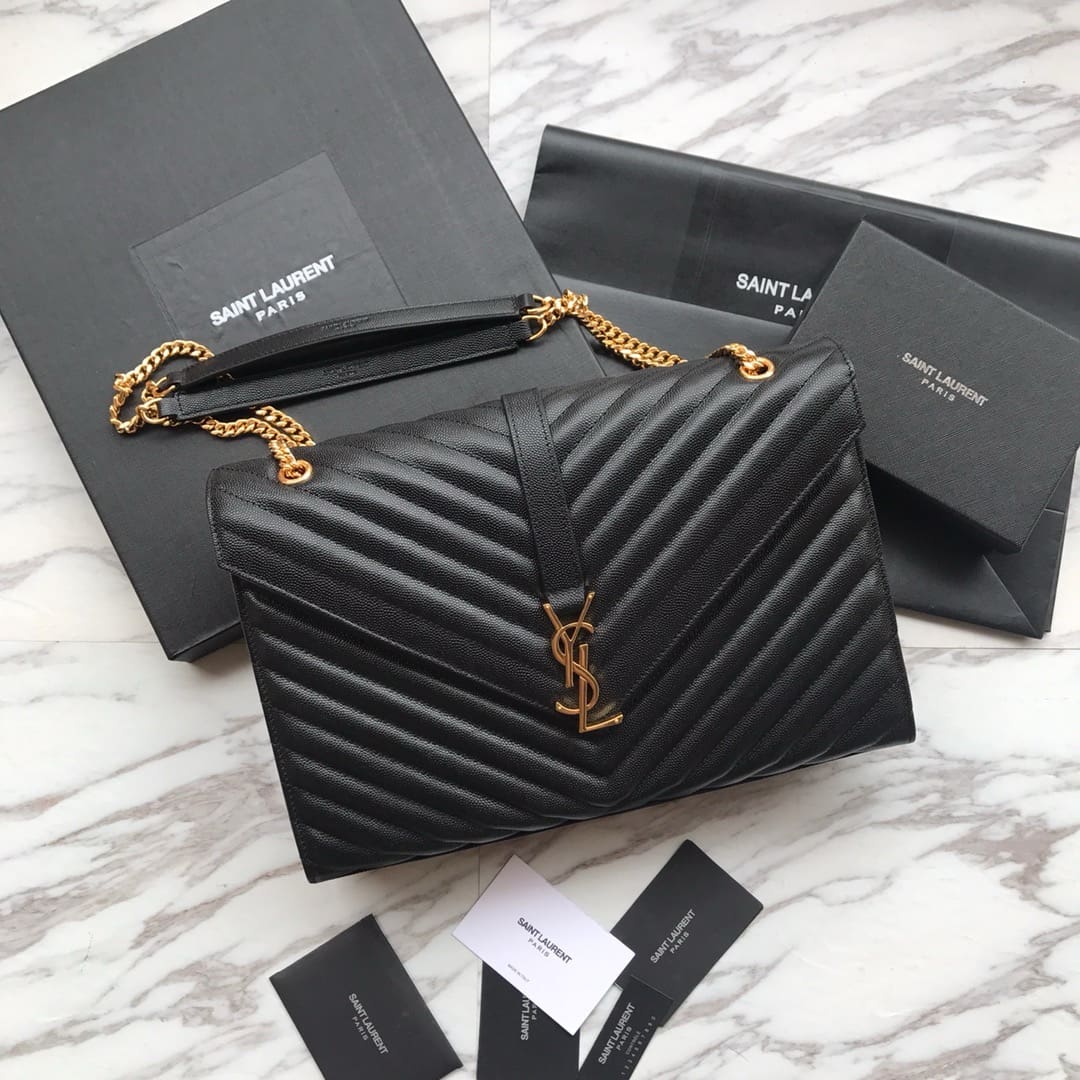 CLASSIC MONOGRAM Saint Laurent DOUBLE GOURMETTE CHAIN FLAP FRONT BAG IN TEXTURED MATELASSe LEATHER WITH GOLD-TONED METAL YSL SIGNATURE AND MATELASSe STITCHING.