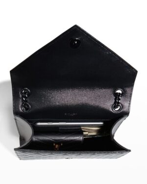 Saint Laurent’s ‘Envelope’ bag earns its name from the distinctive shape and flap fastening. It’s been made in Italy from textured leather that’s quilted in three different patterns, all drawing attention to the house’s iconic interlocking logo. Carry it by the top handle, or on your shoulder using the sliding chain strap.